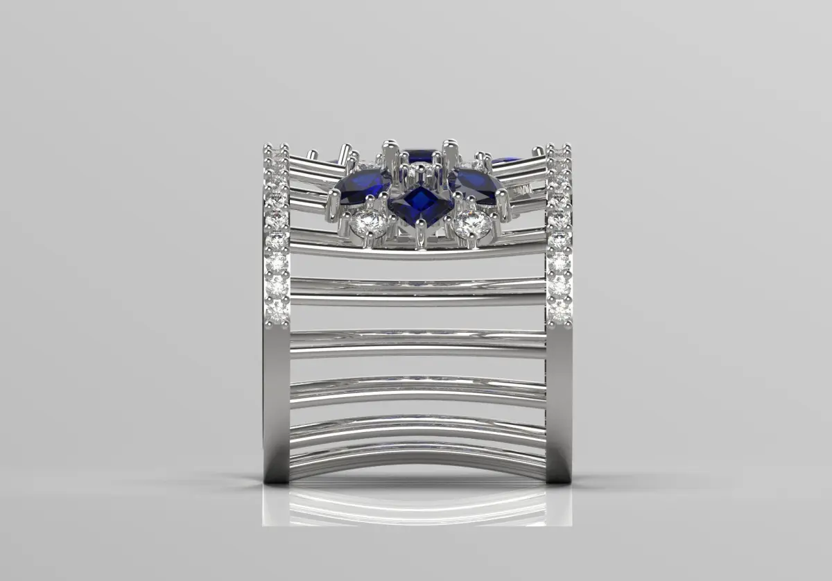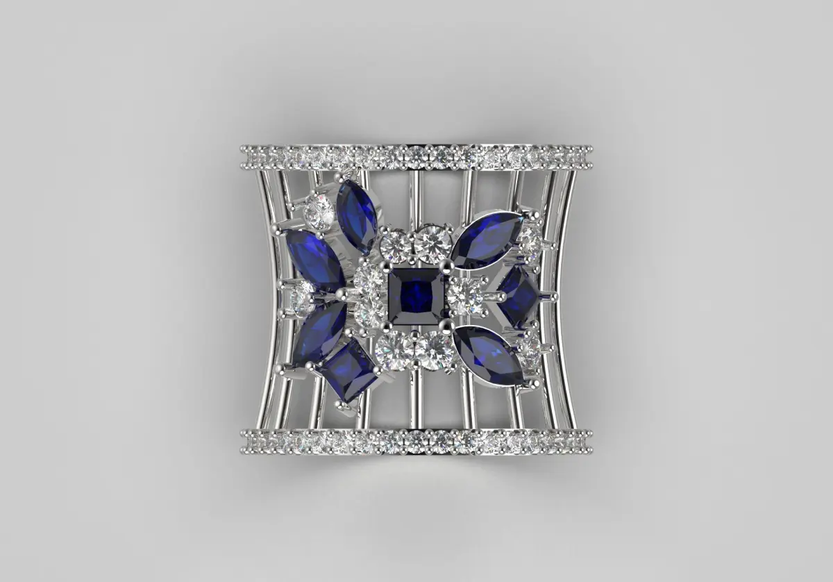 This stunning and intricately designed ring has a modern and distinctive look. Its wide band has an open and lattice structure that creates a stylish and intelligent atmosphere. At the center of this ring, a flower-shaped decoration with deep blue gemstones, including square and teardrop cuts, is surrounded by sparkling diamonds.