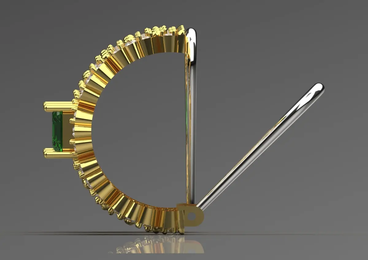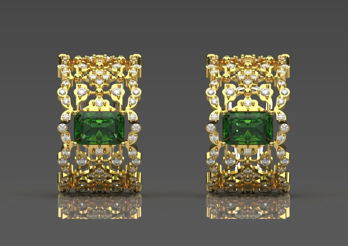 These earrings showcase an exquisite design featuring a vibrant emerald green gemstone set in a luxurious gold setting. The emerald green gemstone is cut into a rectangular shape, enhancing its rich color and brilliance.