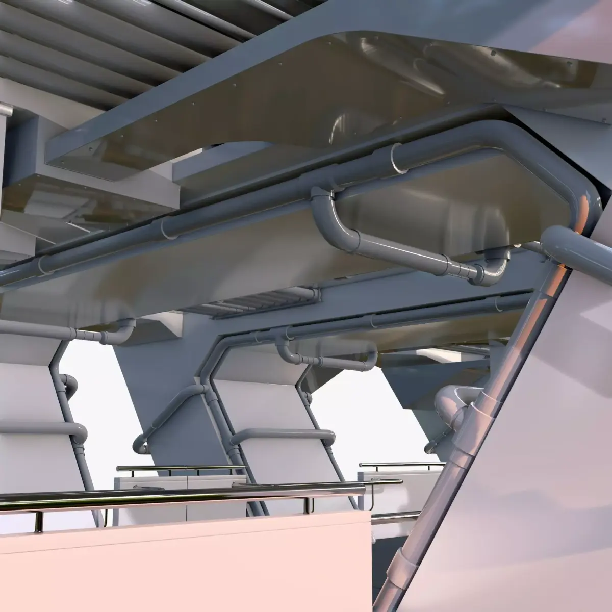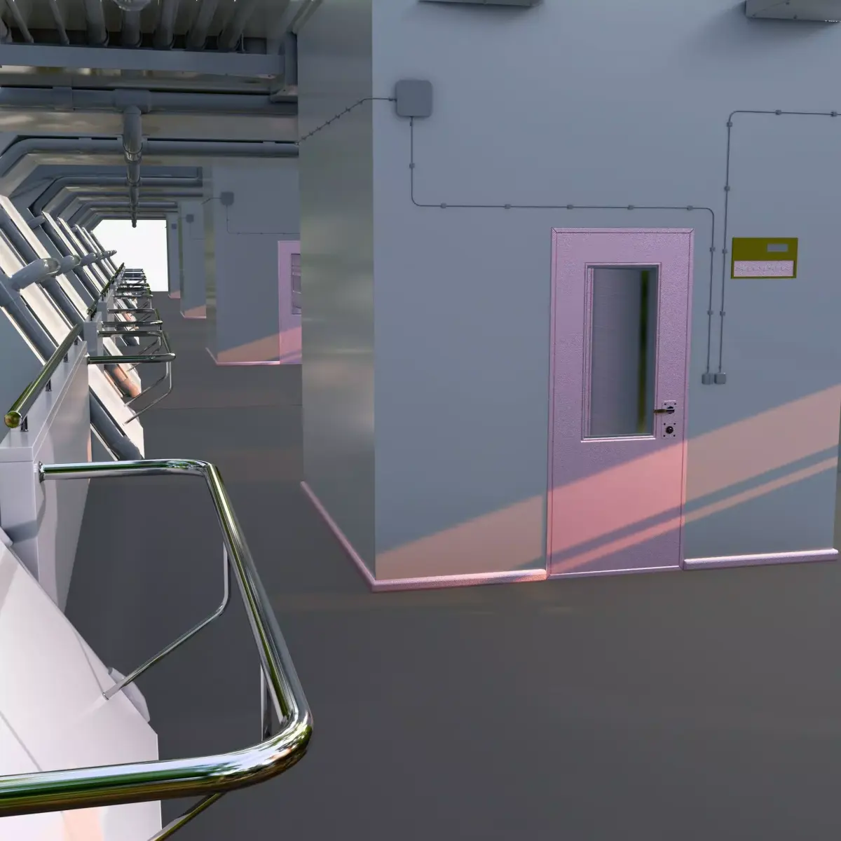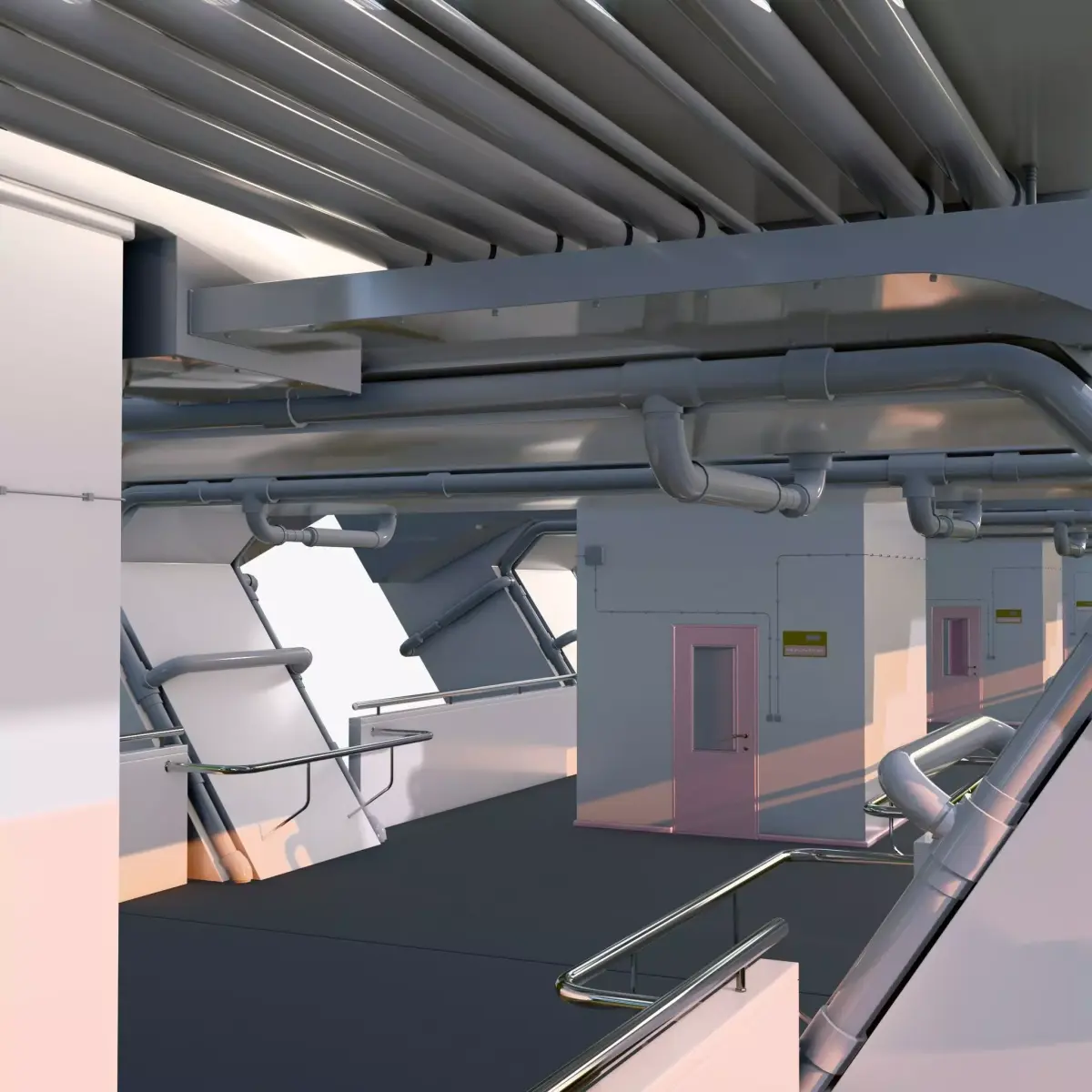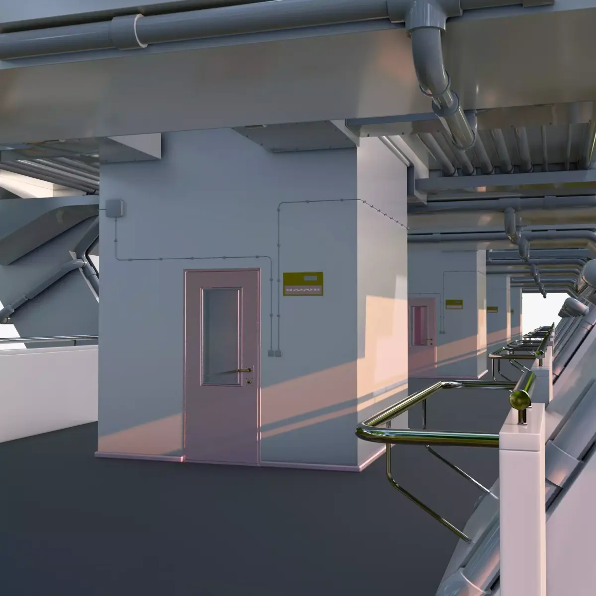 Bridge lower deck section or industrial corridor. Open, well-lit space with side spans and massive angular supports. A complex engineering network of thick grey pipes runs under the ceiling and along the walls. Shiny metal railings are installed along the walkway, and a technical block with pale pink doors, windows, and wall wiring is located in the center.