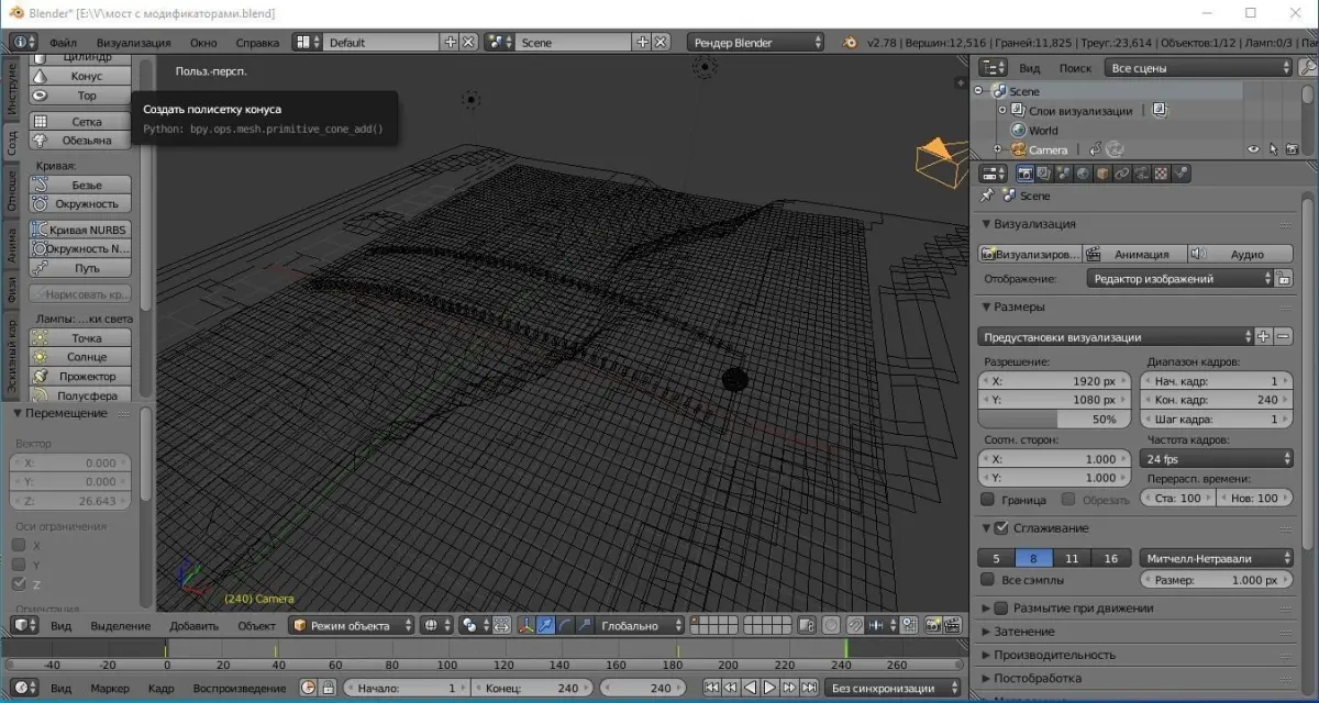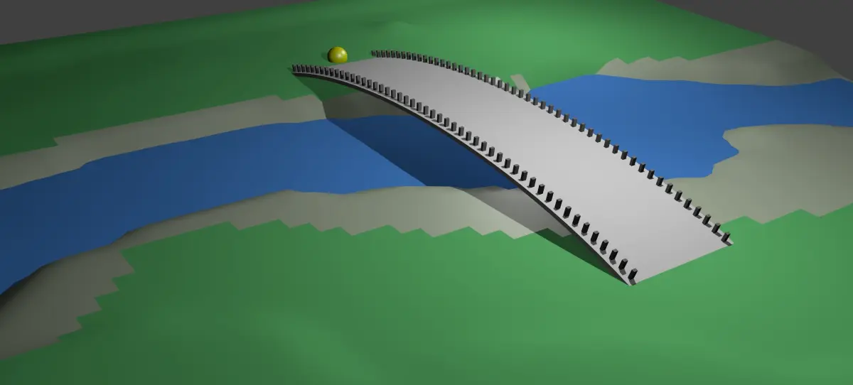 This 3D model was created using the blender program. When creating this model 3d modifiers were used. This is not only a bridge, but also a river, shore, waves, terrain, animation and crossing an object across a river.