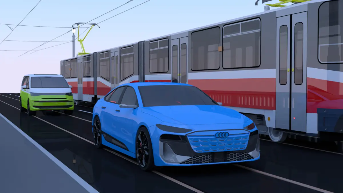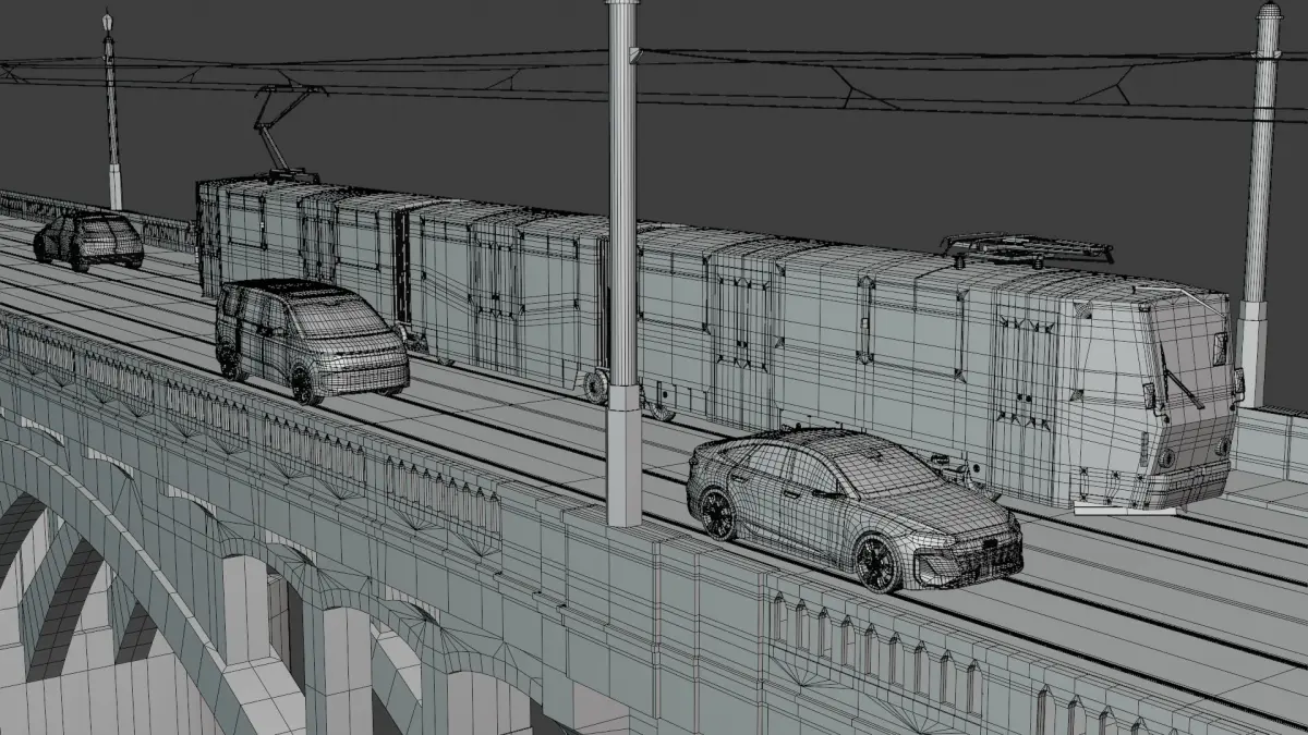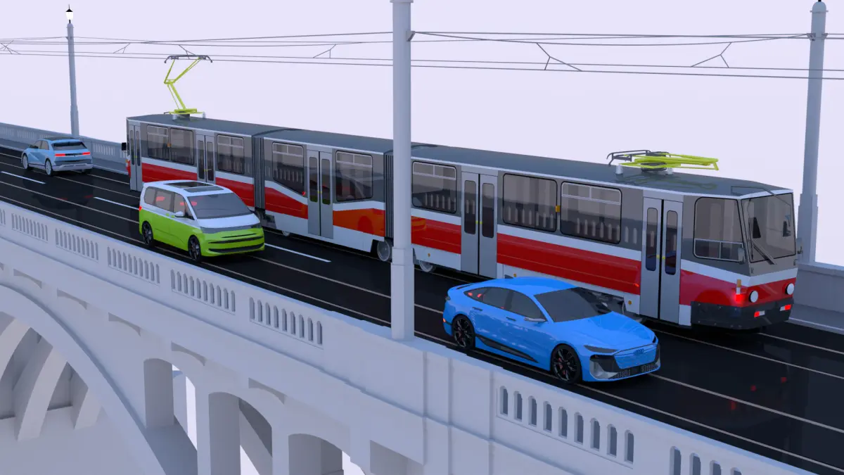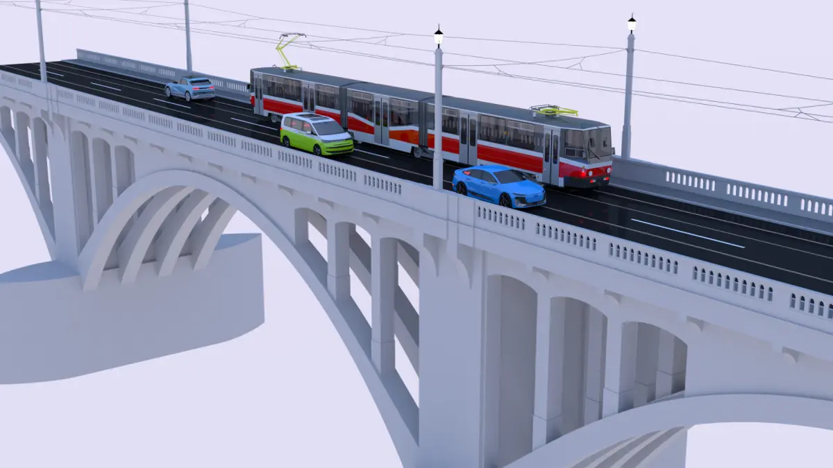 - This is 3D model of bridge with tram KT8D5 and electromobiles Audi A6 e-tron sportback, VW multivan and Hyundai IONIQ.