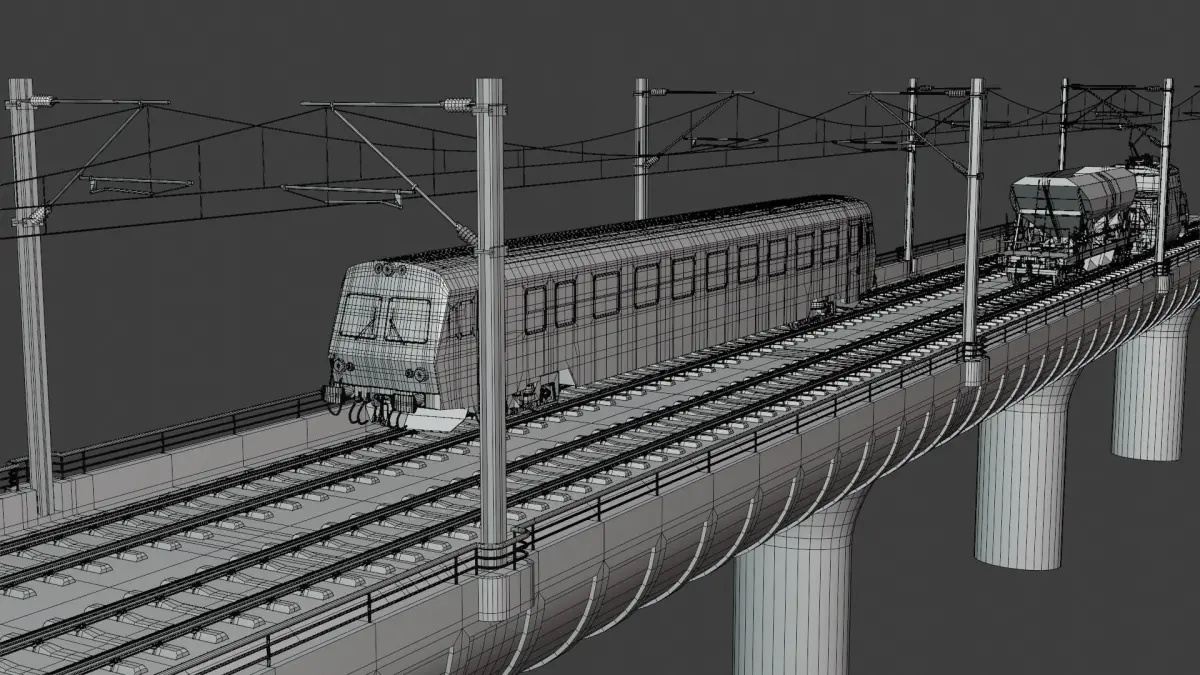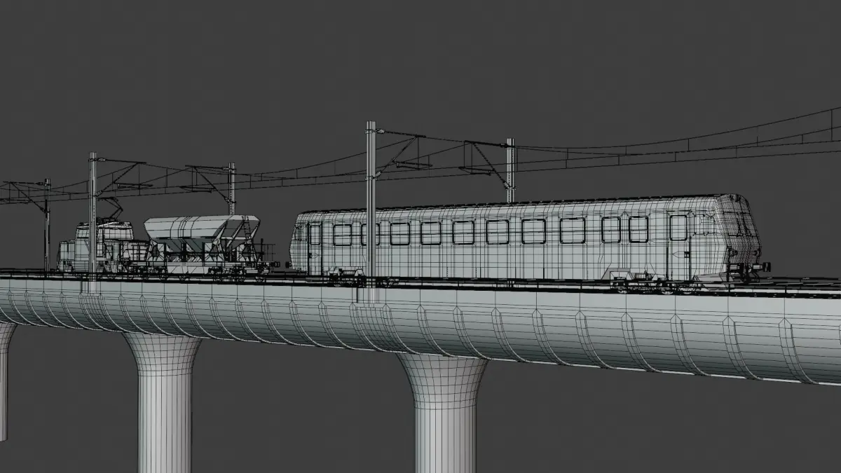 - This is 3D model of bridge with passenger and cargo train (locomotive Stadler Ee 922 with hopper car).