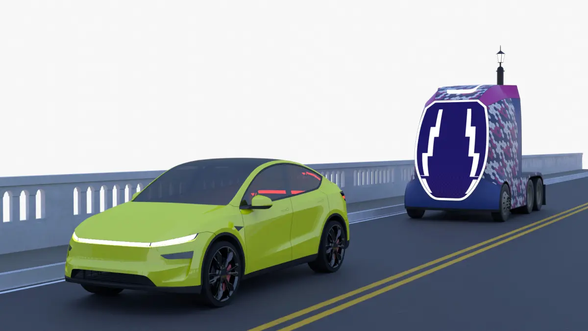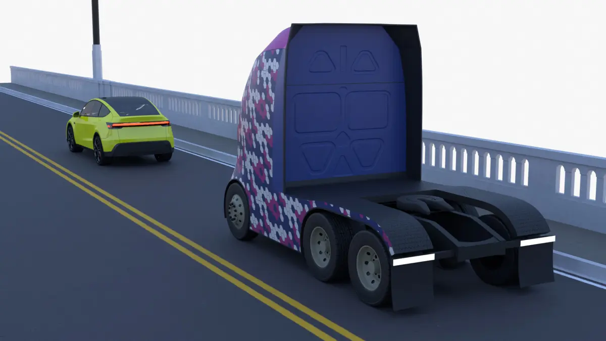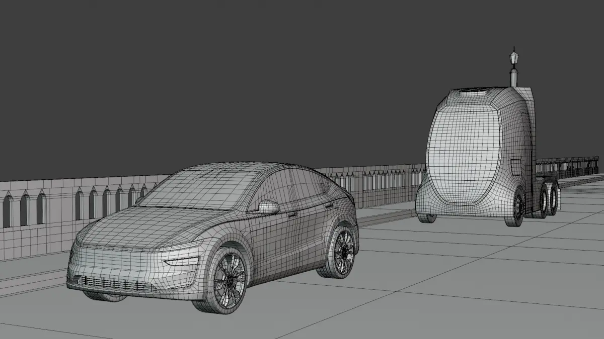 - This is 3D model of road bridge with futuristic semi-truck and Tesla Juniper car.