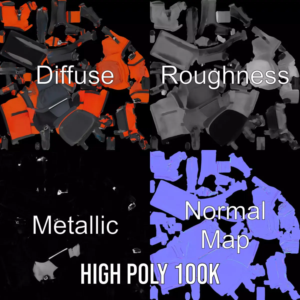 The model's textures are PBR, Diffuse, NormalMap, and reflection/roughness/metallic, which are suitable for any modern rendering engine. All models accurately unwrapped and have no overlapping UVs. All textures are 4096*4096 in size.