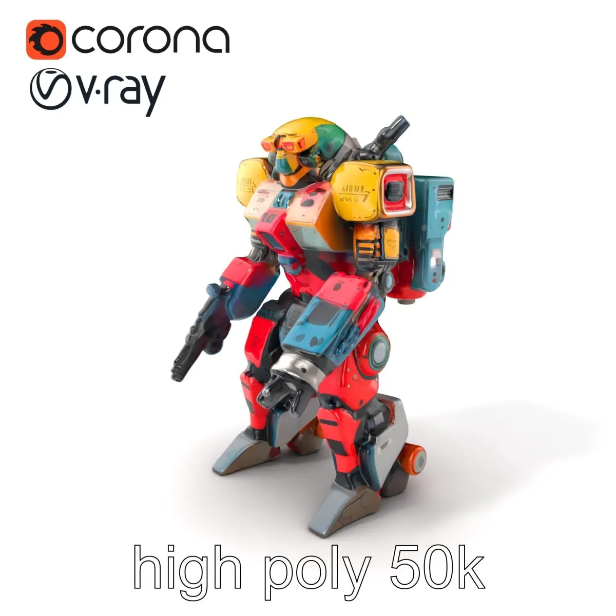 This brightly colored humanoid military robot is perfect for futuristic simulations and sci-fi games. With realistic metallic textures and highlighted mechanical joints, it is ideal for high-energy action scenes or tactical simulations. Its advanced weaponry optics add depth and functionality suitable for strategical game environments.