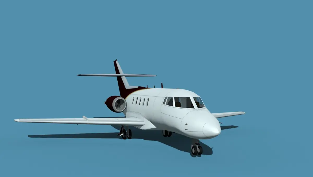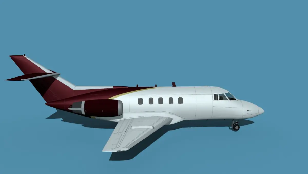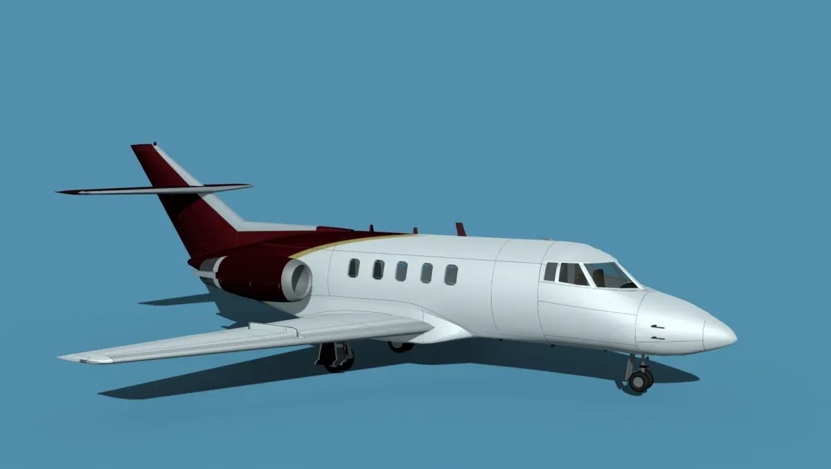 Originally the BaE 125 was developed by De Havilland and inistially designed as the DH125 Jet dragon. Until 1977 the designation was changed to reflect the Hawker Siddley ownership and in production as Hawker Siddley HS-125. After 1977 it became known as the Hawker Siddley Dominie T1. It was a light midsize twin jet powered business executive transport. It had a cruise speed of 454 knots and a range of 1650 NMI.The model was built near to scale in real units and built based on drawings, photos, and other documents. This model has a moderately detailed cockpit and the following animateable features; ailerons, elevators, rudder, and wheels. These models render very well and look very realistic using good animation, lighting and rendering technique. It can be used in an animated or static position within a scene, animation or animated video, or possibly programming for a flight simulation application. This model was not designed for 3d printing, these are to be used as digital files only. If you purchase one for digital printing we do not guarantee that your print will be successful.Exporting of models is limited but good for several software applications. This model is fully textured with all materials UVW mapped and applied. Most materials are planar mapped and major materials include texturing. All textures and materials are included as shown. Objects are logically named for ease of scene management.No cleaning up necessary, just drop your models into the scene and start rendering.No special plug-ins are needed to open scene.In most cases the liveries are based on actual service liveries or paint schemes. Many of the units, airlines or countries who flew the plane are represented here. Dreamscape Studios is a US 3d modeling firm specializing in building high definition, accurate, and detailed 3D models of commercial, civilian, and military airplanes, ships, buildings and other subjects.Dreamscape 3d models are built in ultra-low to ultra-high polygon count, (most often) near to scale and include a good amount of detail based on the resolution target. If you have a question, error or problem with the model, let us know and we will do our best to provide or get a solution for you. Be advised our models are not designed for 3d printing unless they are advertised for that purpose.