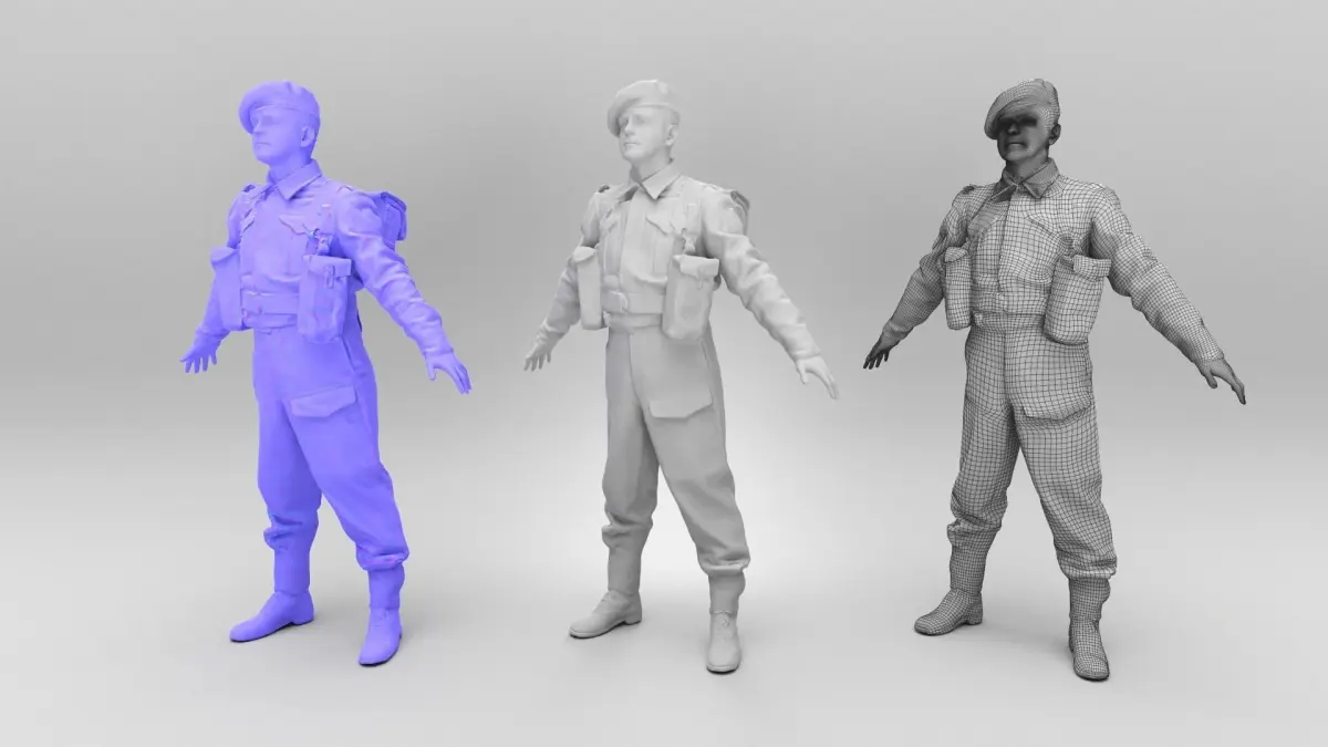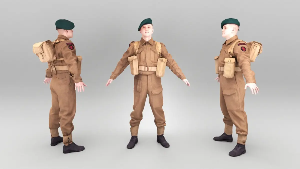 This is a true human size and detailed model of a British infantry character from 1940s. All props and suit are original. The model is captured in the A-pose with mesh ready for rigging and animation in all most usable 3d software.