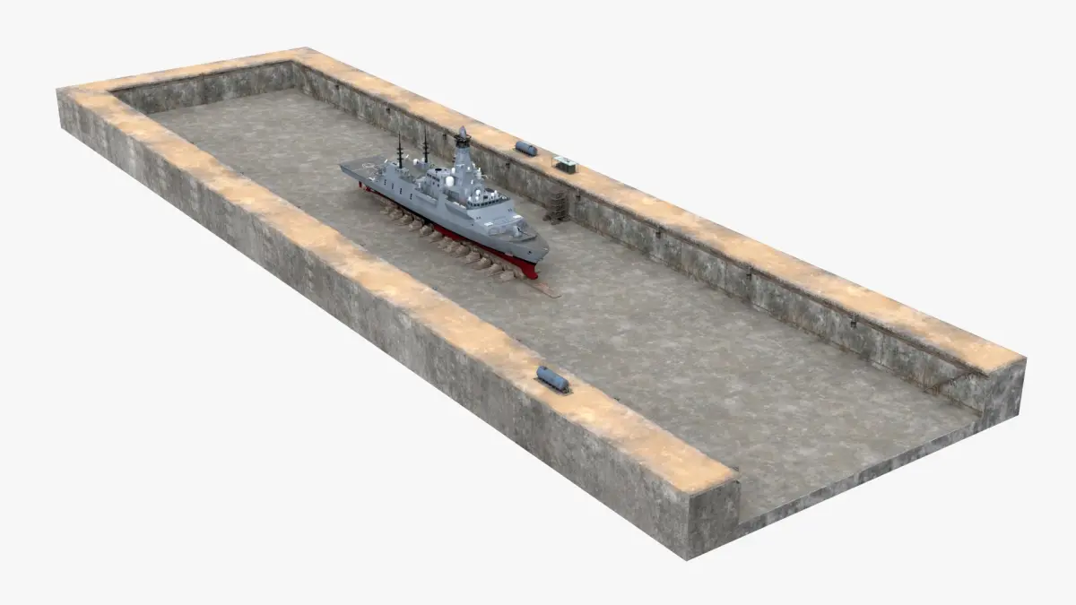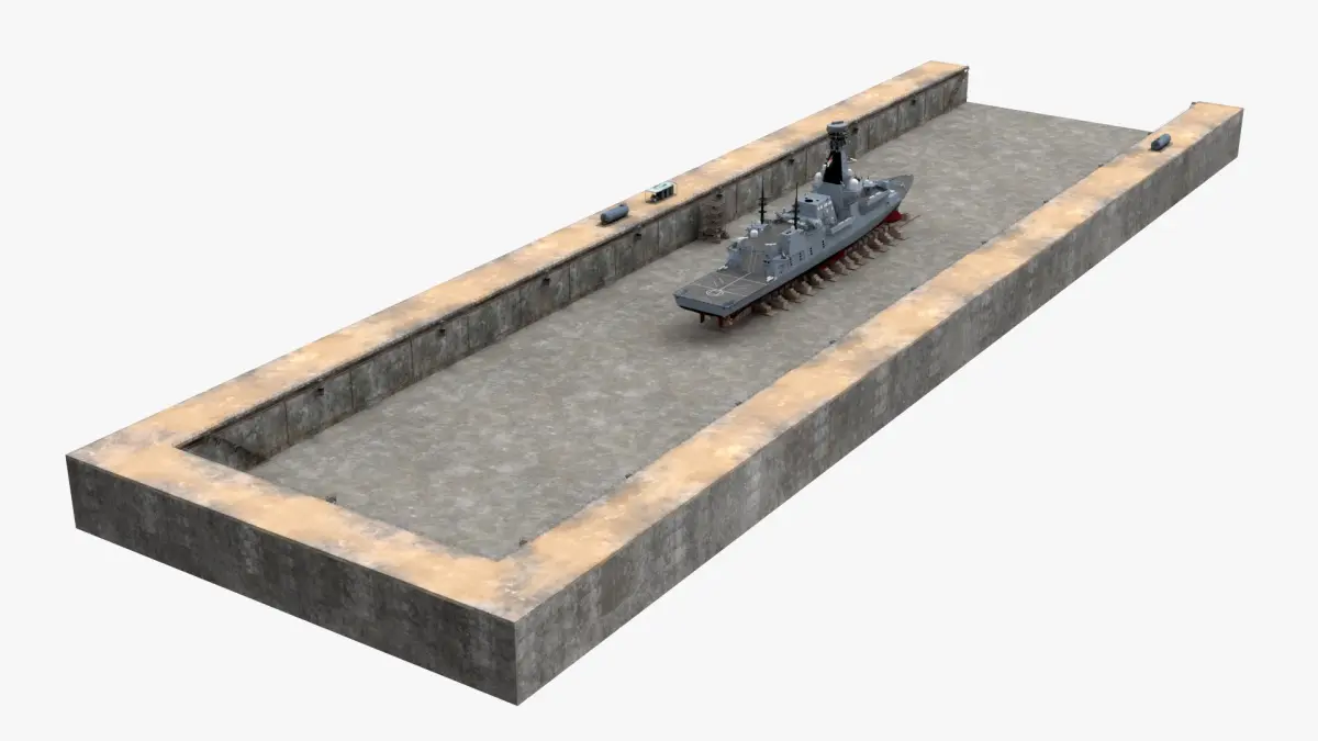British Naval Warship Type 26 Drydock Grey is a 3d model of a modern naval combat vessel, showcasing the latest in warship technology and design.