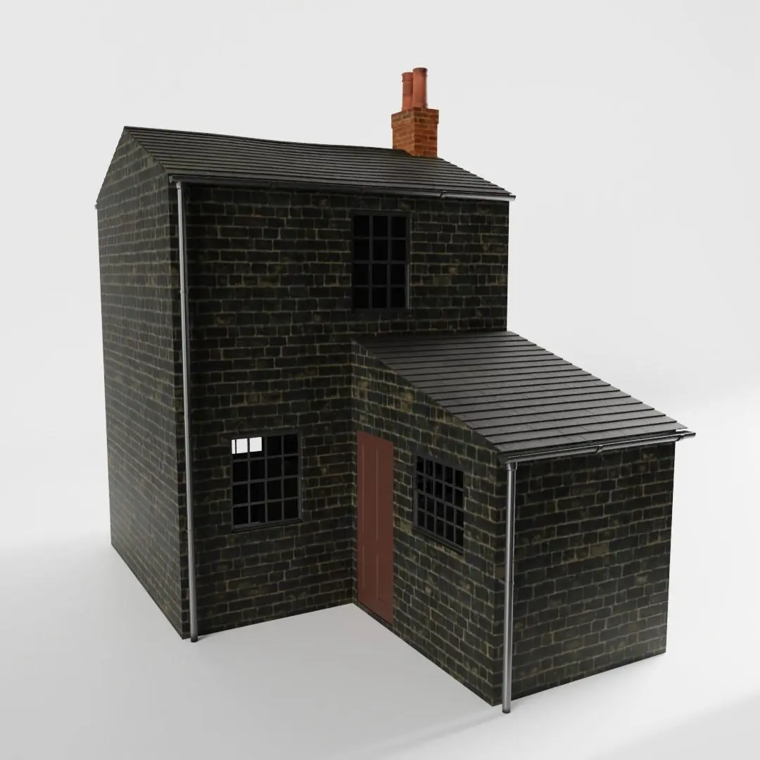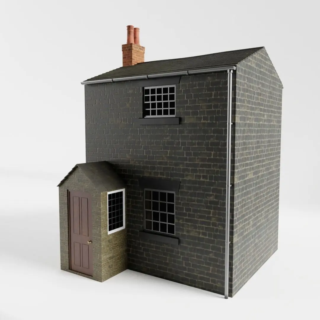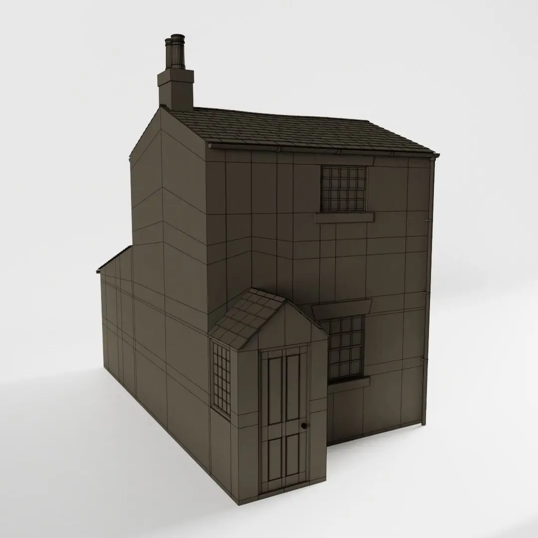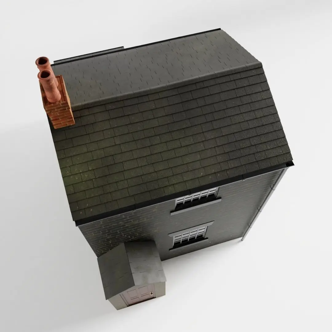 The model has real world scale and measures approximately 6.24 m in depth, 3.55 m in length and 5.48 m in height. Only the outside of the house is detailed, but the walls are solid.