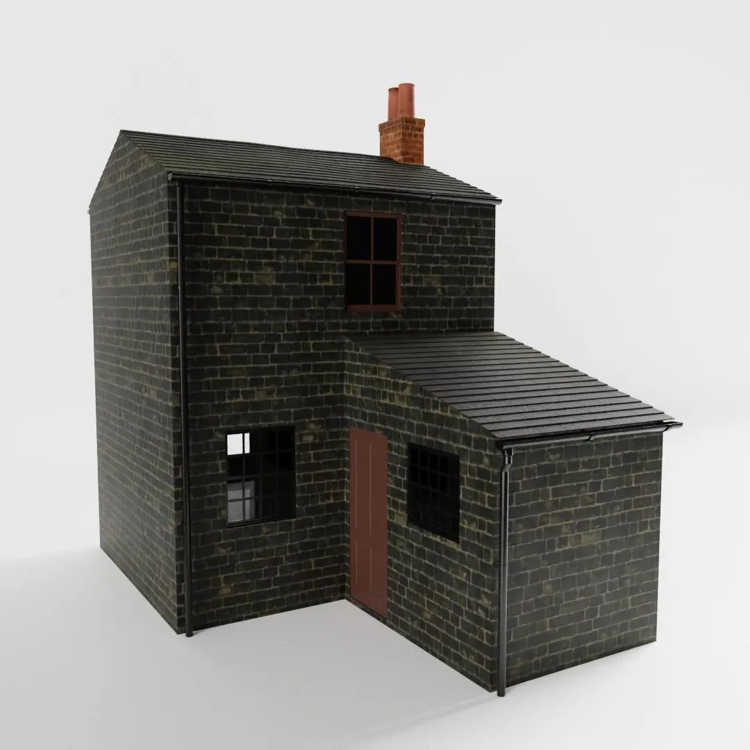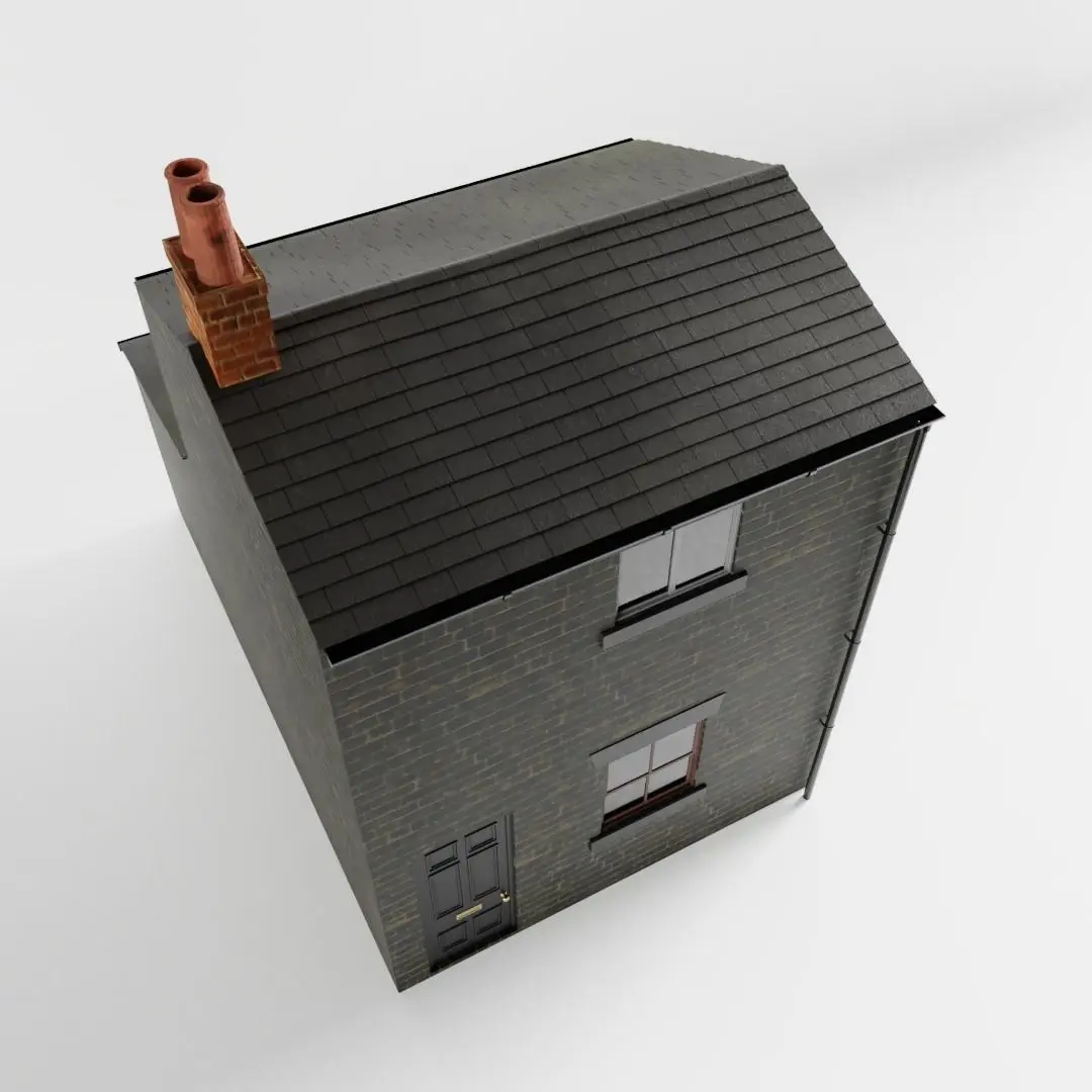 The model has real world scale and measures approximately 5.55 m in depth, 3.55 m in length and 5.43 m in height. Only the outside of the house is detailed, but the walls are solid.