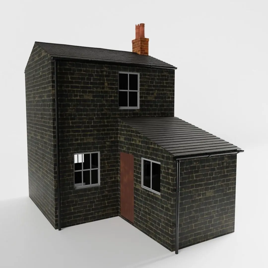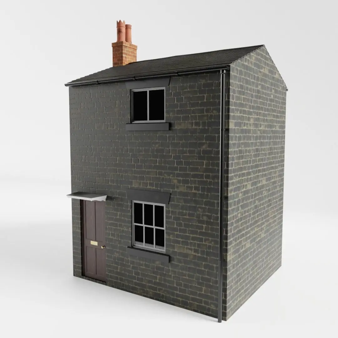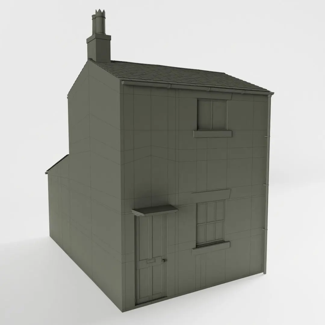 The model has real world scale and measures approximately 5.77 m in depth, 3.55 m in length and 5.52 m in height. Only the outside of the house is detailed, but the walls are solid.