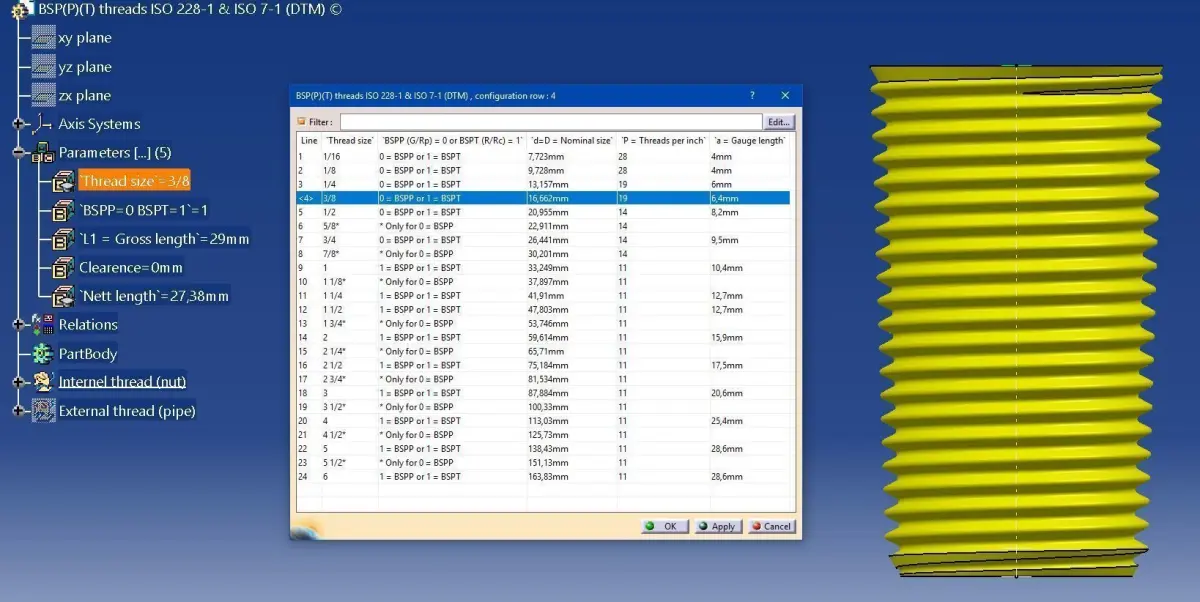Catia V5 R24 surface model of all BSP(P)(T) threads according to ISO 228-1 & ISO 7-1.