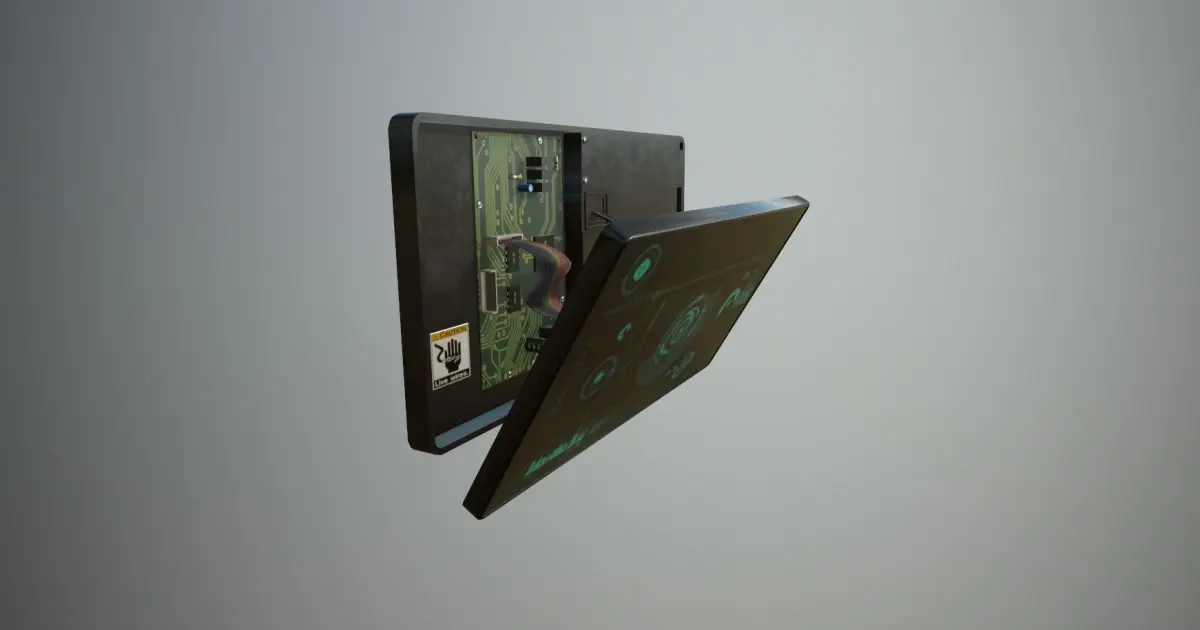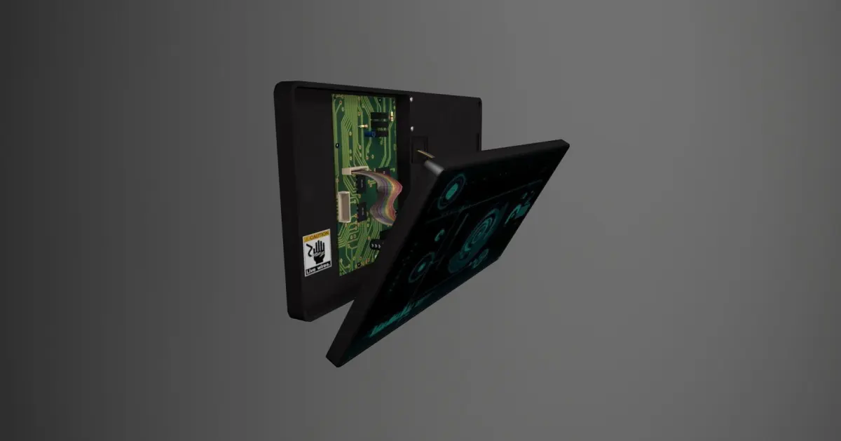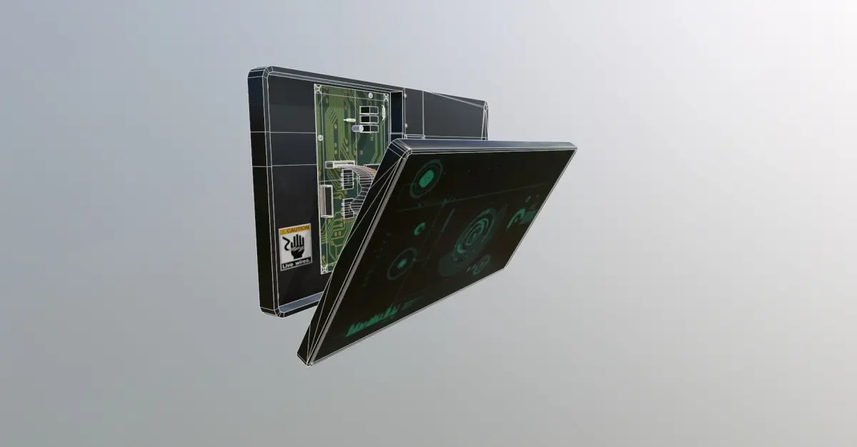 Generic broken/ being repaired/ sabotaged, wall-mounted display panel.