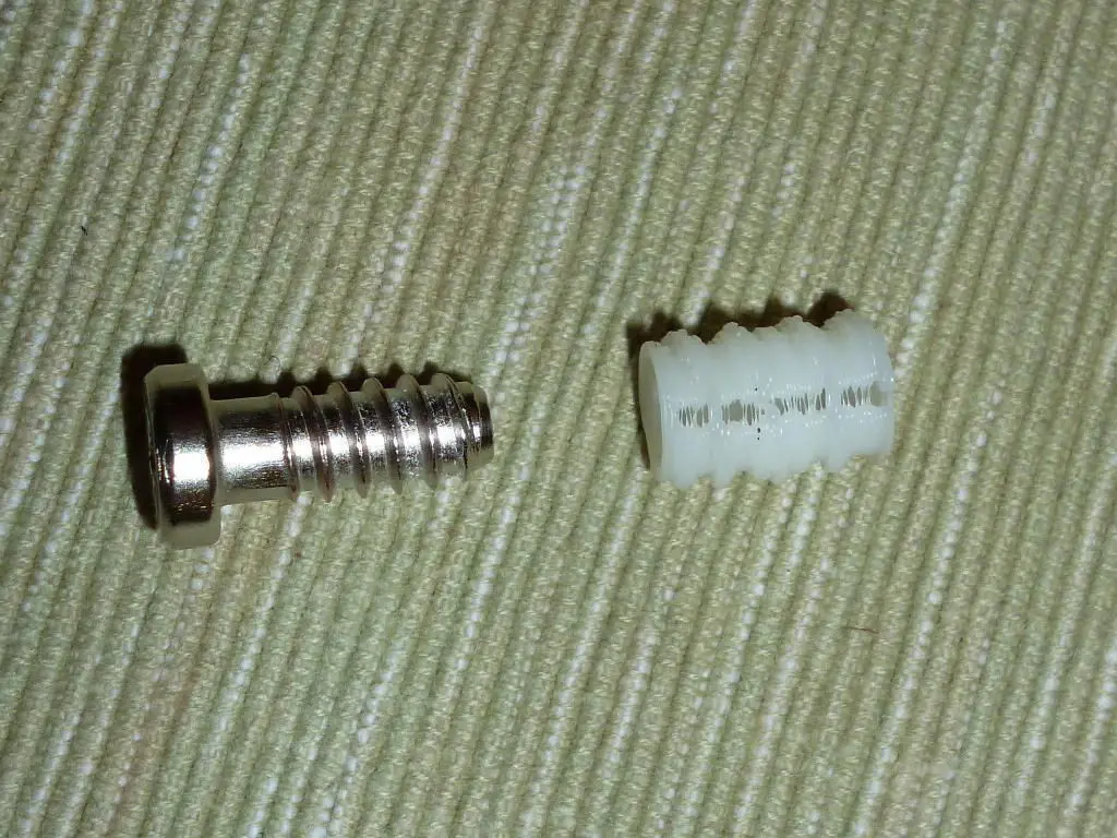 The hinge of a cabinet door in my kitchen was a bit loose. The screws that held it to the wall in the cabinet broke free from their holes. This thing is an attempt to repair this by giving the screw a wider circumference.