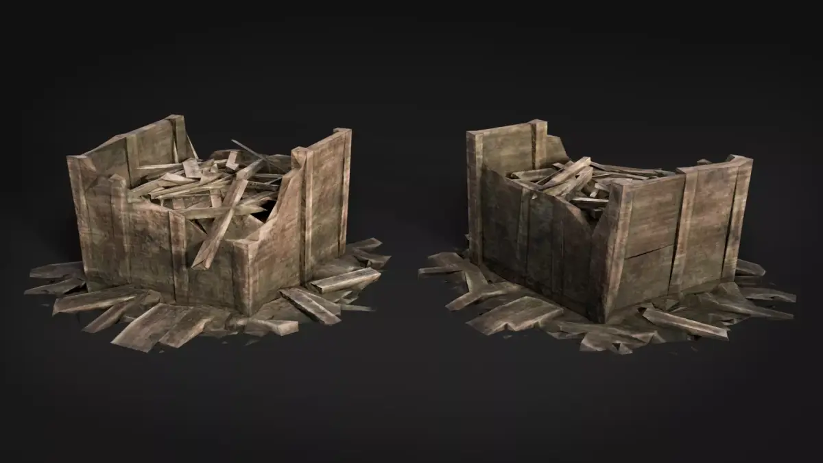 - 29 assets: broken planks, wood debris piles, crates, pallets, scattered splinters.