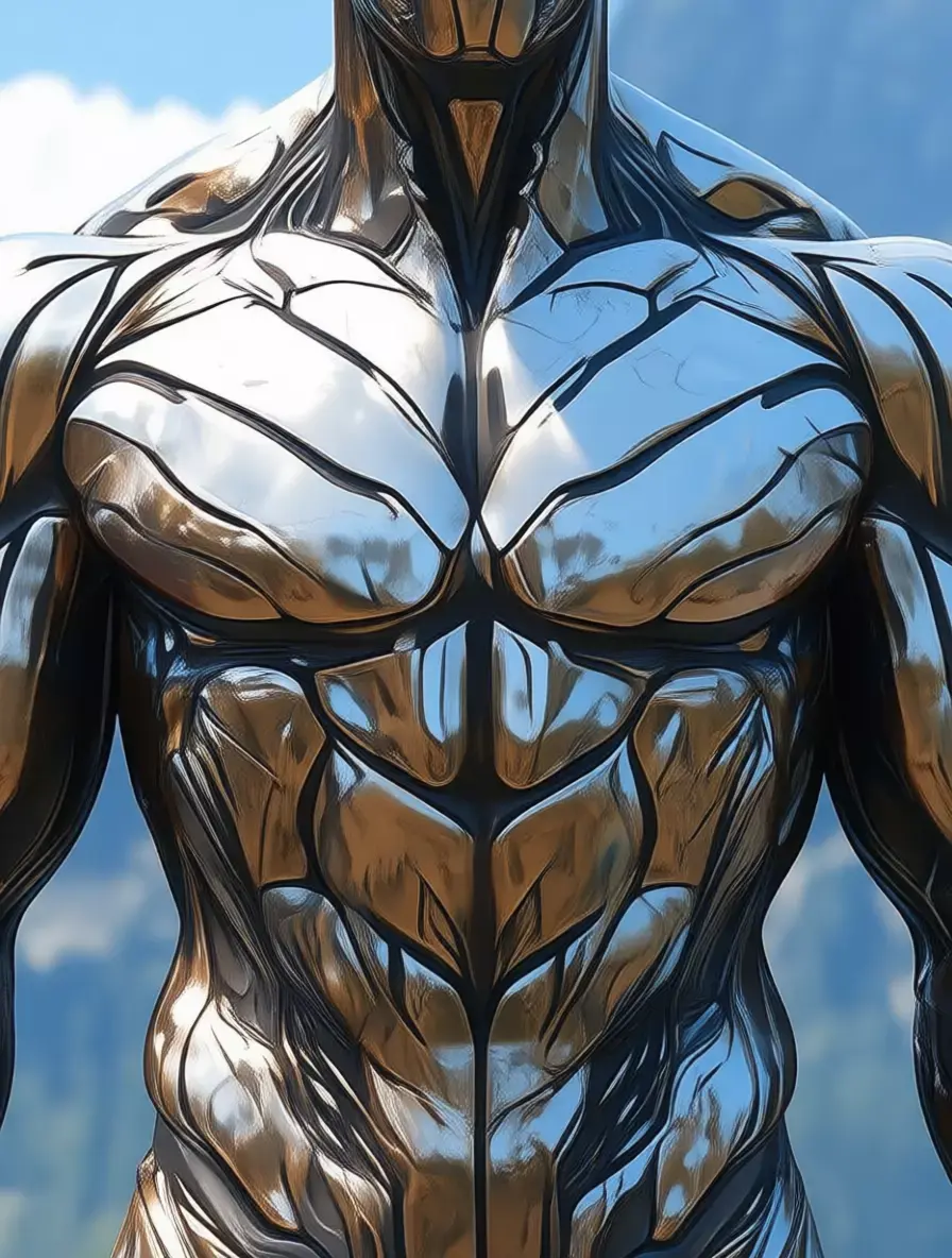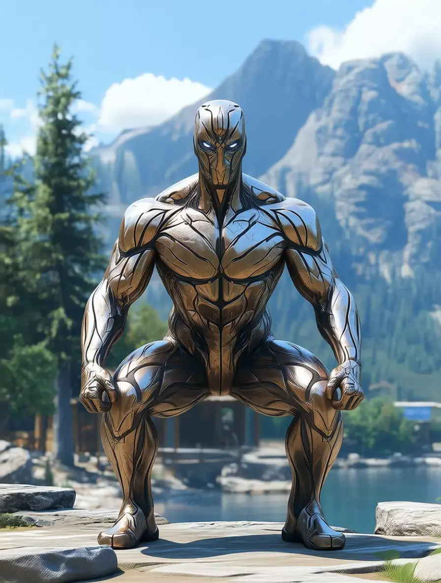 Ultra-realistic 3D model of a bronze colossus statue, designed as a powerful and imposing piece that blends classical artistry with modern grandeur. The figure is rendered in rich, weathered bronze—resembling aged metal—with deep, textured grooves that mimic the contours of human musculature. Its form is highly detailed, showcasing every ridge, vein, and tendon, creating a sense of raw strength and divine power.