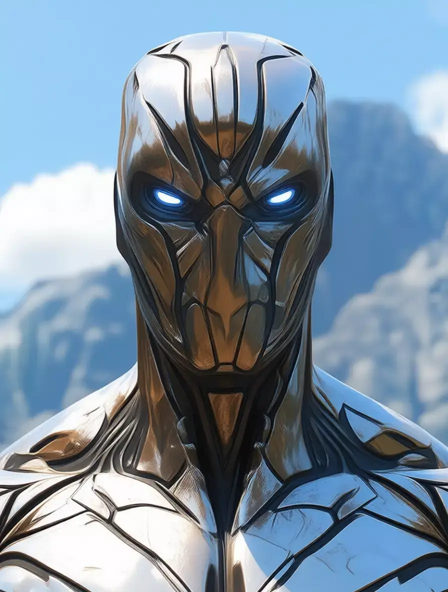 The statue stands tall and proud on a stone plinth, arms slightly bent at the sides, fists clenched, and head held high with glowing blue eyes that add a touch of life and mystery to its expression. The surface is polished to a high sheen, reflecting the surrounding environment and enhancing its majestic presence. Subtle imperfections and patina suggest age and exposure to the elements, adding to its timeless appeal.