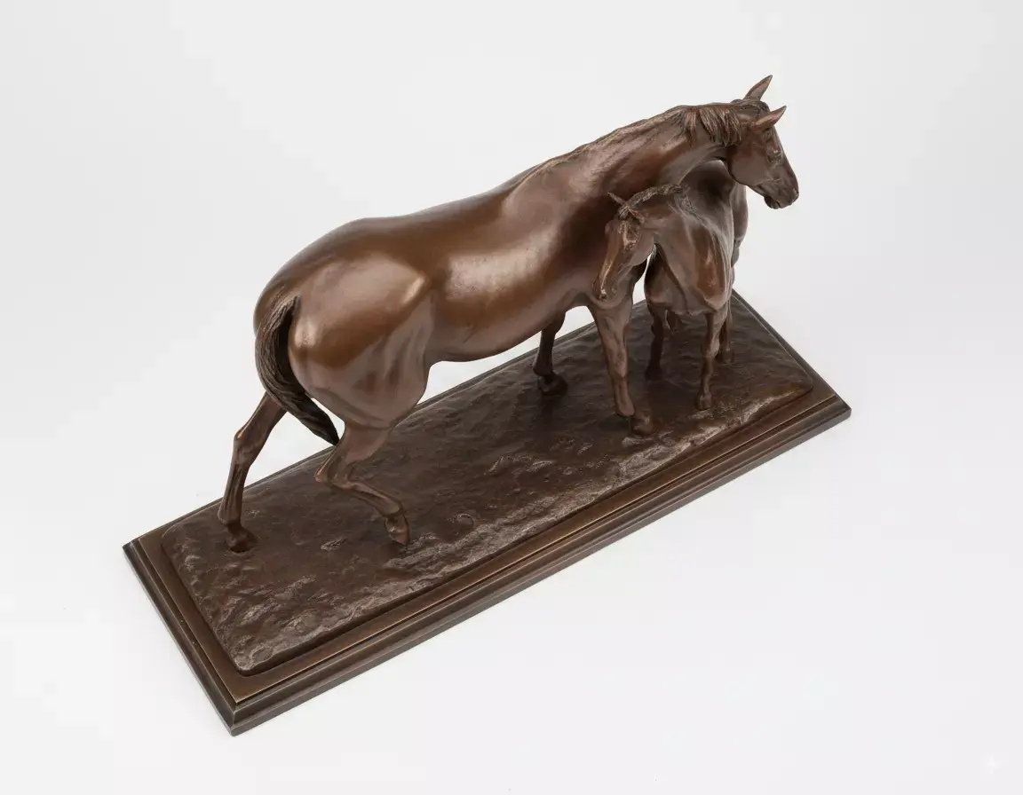 The foal, standing close beside her, is depicted in a youthful, delicate stance with slender legs, soft joints, and a slightly curved back, reflecting its early stage of life. Its head is raised, looking upward toward the mare, capturing a moment of trust and dependency. Both animals feature realistic hooves, textured skin, and subtle surface imperfections such as faint scratches and natural wear, enhancing their authenticity. The sculpture rests on a rectangular stone base with a smooth, reflective finish, grounding the scene and emphasizing its artistic presence.
