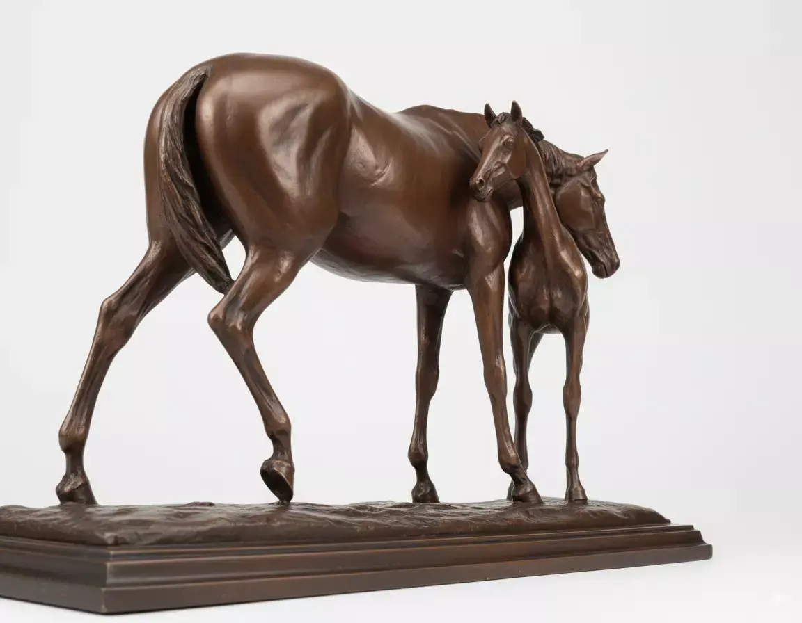 Ultra-realistic 3D model of a bronze sculpture depicting a majestic mare and her foal, captured in a tender moment of maternal connection. The artwork is rendered in rich, polished bronze with a warm, golden-brown patina that enhances the lifelike texture and depth of the figures. The mare stands gracefully with a strong, elegant posture, her body slightly turned as she gently nuzzles or rests her head over the foal, conveying affection, protection, and natural bonding. Her musculature is meticulously detailed—showcasing defined shoulders, rippling abdominal muscles, and powerful legs—while her mane flows softly along her neck, adding grace to her form.