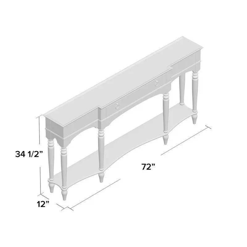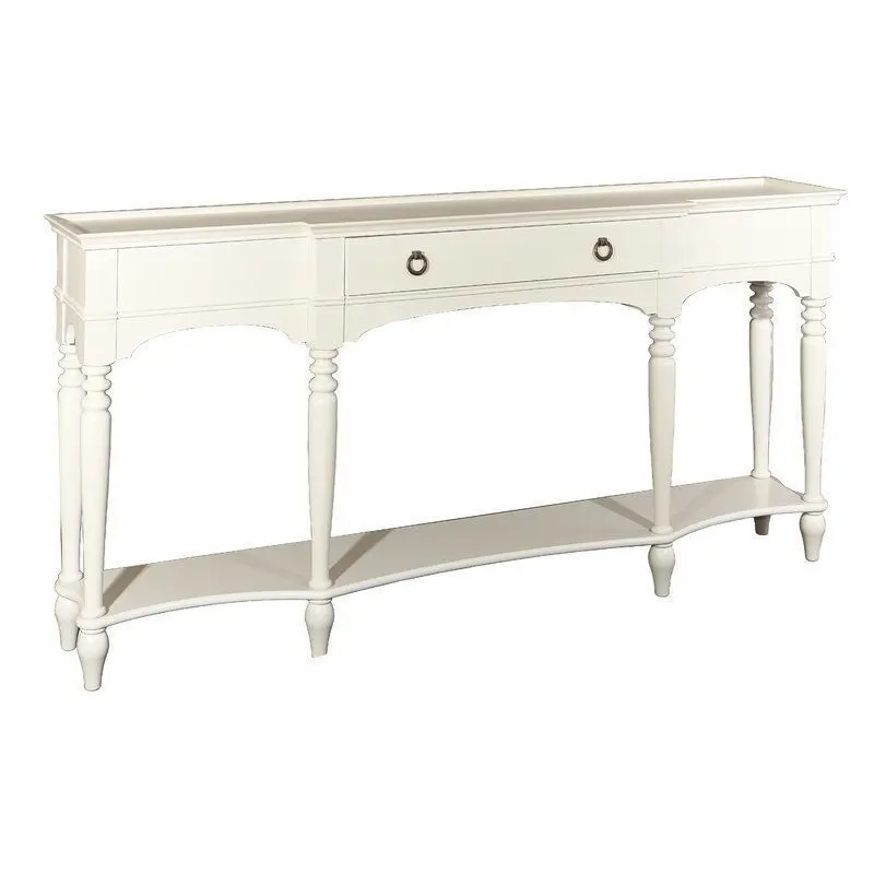 - The Console Table is an updated take on a classic slimline silhouette for your home. The long breakfront console features raised banding details along the top. The middle panel has a drawer with wooden glides, accented with oil rubbed bronze circular drawer pulls. An arch detail frames the open scalloped shelf at the bottom while the round, turned legs provide support.