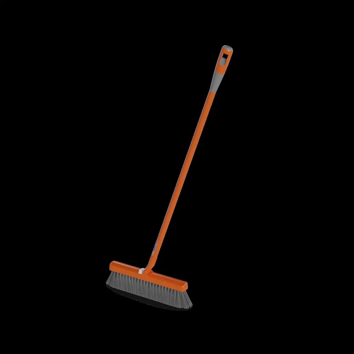 Broom: A versatile broom with soft, synthetic bristles that can be used on both wet and dry surfaces. The broom features an adjustable handle for customized height and a built-in scraper for removing stubborn dirt. The packaging is a bright orange plastic bag with a resealable top. The label on the packaging includes a graphic of a clean floor and the text All-Purpose Broom - Sweep away messes with ease!