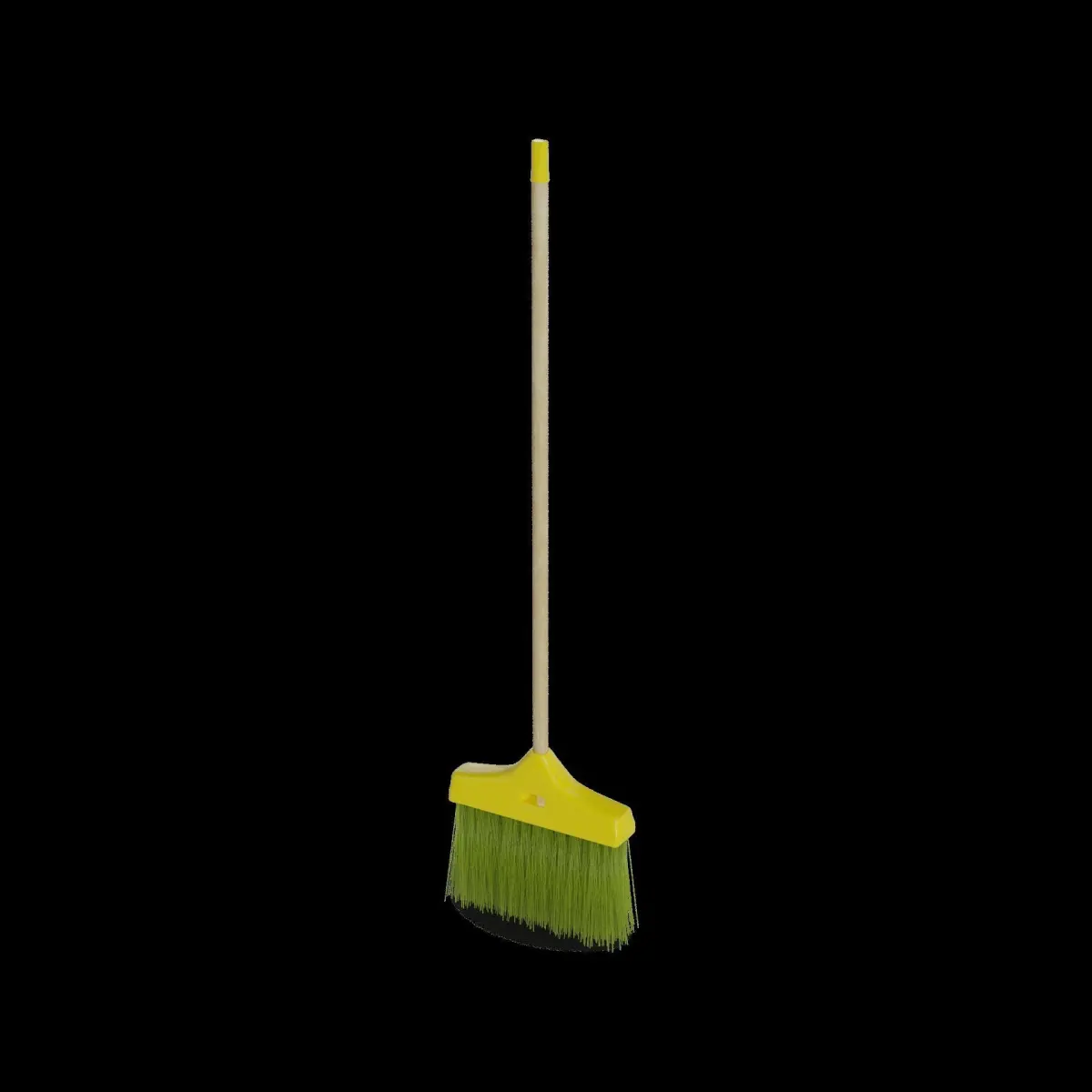 Broom: This broom features a sturdy wooden handle and soft bristles made from natural fibers. The packaging is a vibrant yellow and green cardboard box with a clear window to showcase the broom. The label on the packaging includes a picture of the broom in action, along with the text Sweep away dirt and dust with ease!
