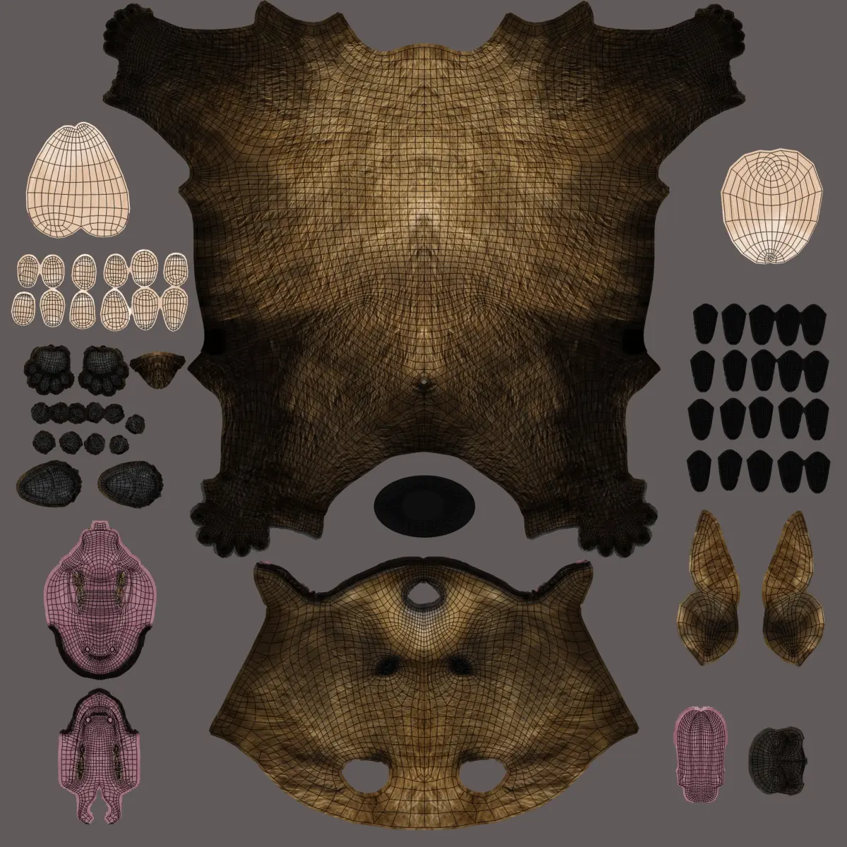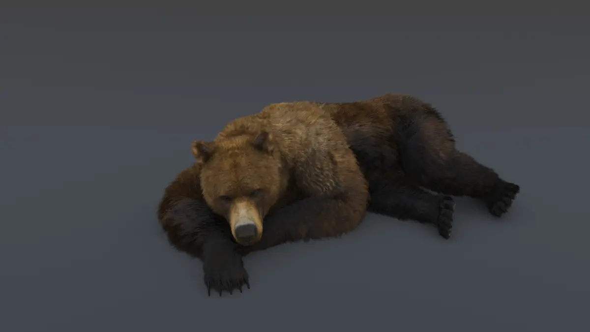 _Introduction_This is a high-quality brown Bear model with fur, rigging and 6 realistic animations. The model has a realistic muscle structure, a complex hair system created in Blender which makes the hair natural and realistic. This model is made with Blender and Cycles renderer at real-world scale. It consists of the body, eyes, eyelids, oral cavity, tongue, paws.