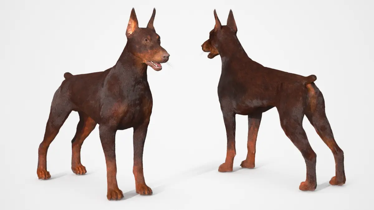Brown Doberman Pinscher Fur Rigged for Maya is a three-dimensional model of specimen of popular dog that was breed for guard duties, and that is a well known guard and working dog.
