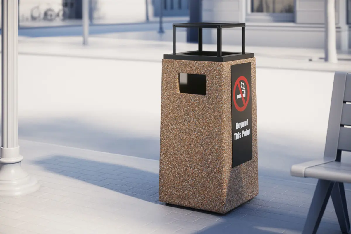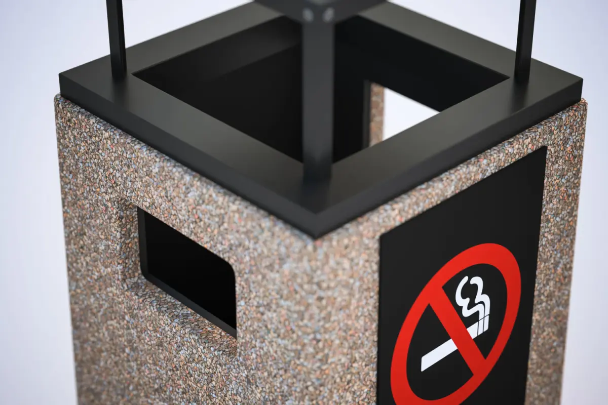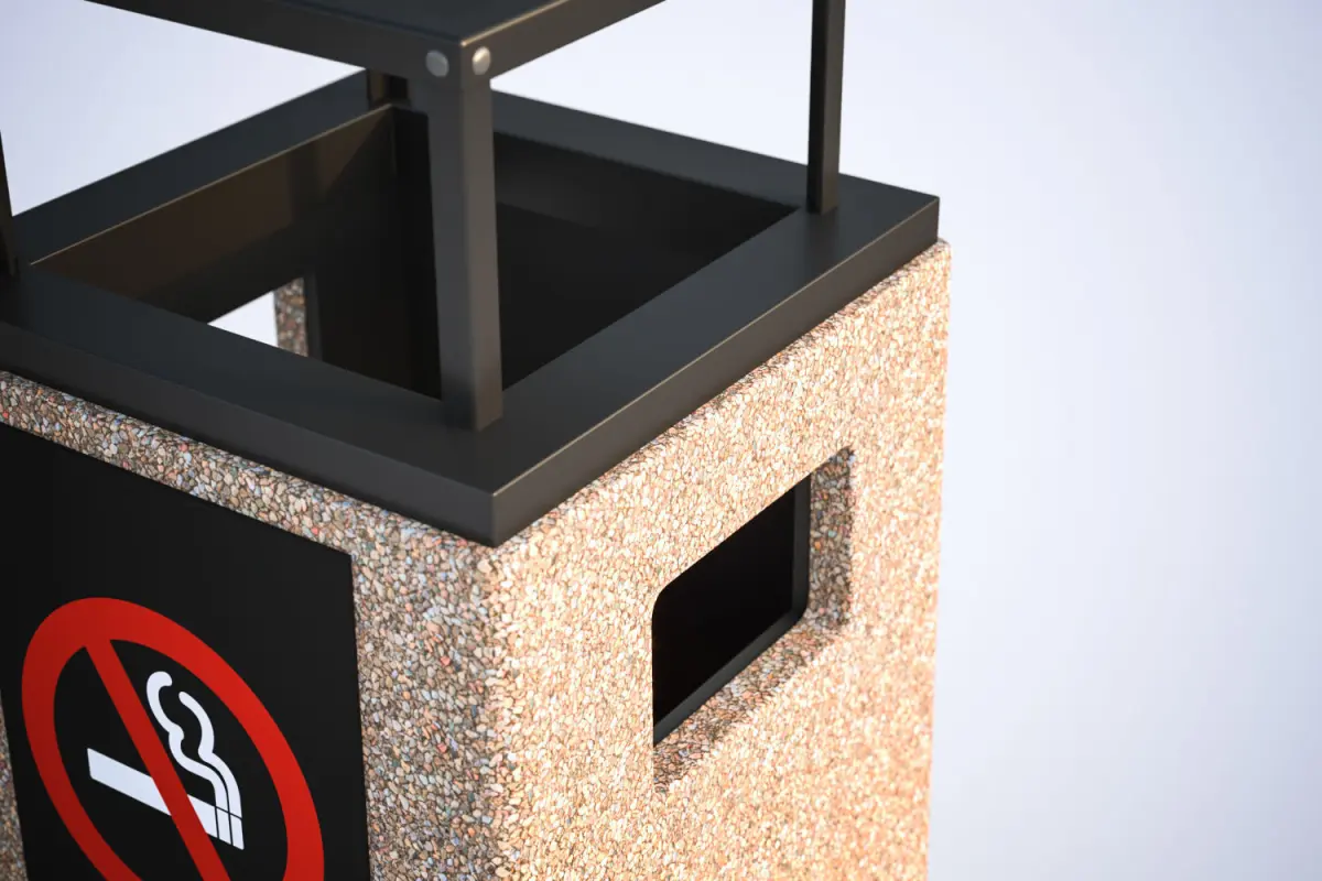 This 3D model includes minimalistic trash bin made of brown concrete. A warning sign on one side.Model prepared for 3d architectural visualisations and other graphic works.