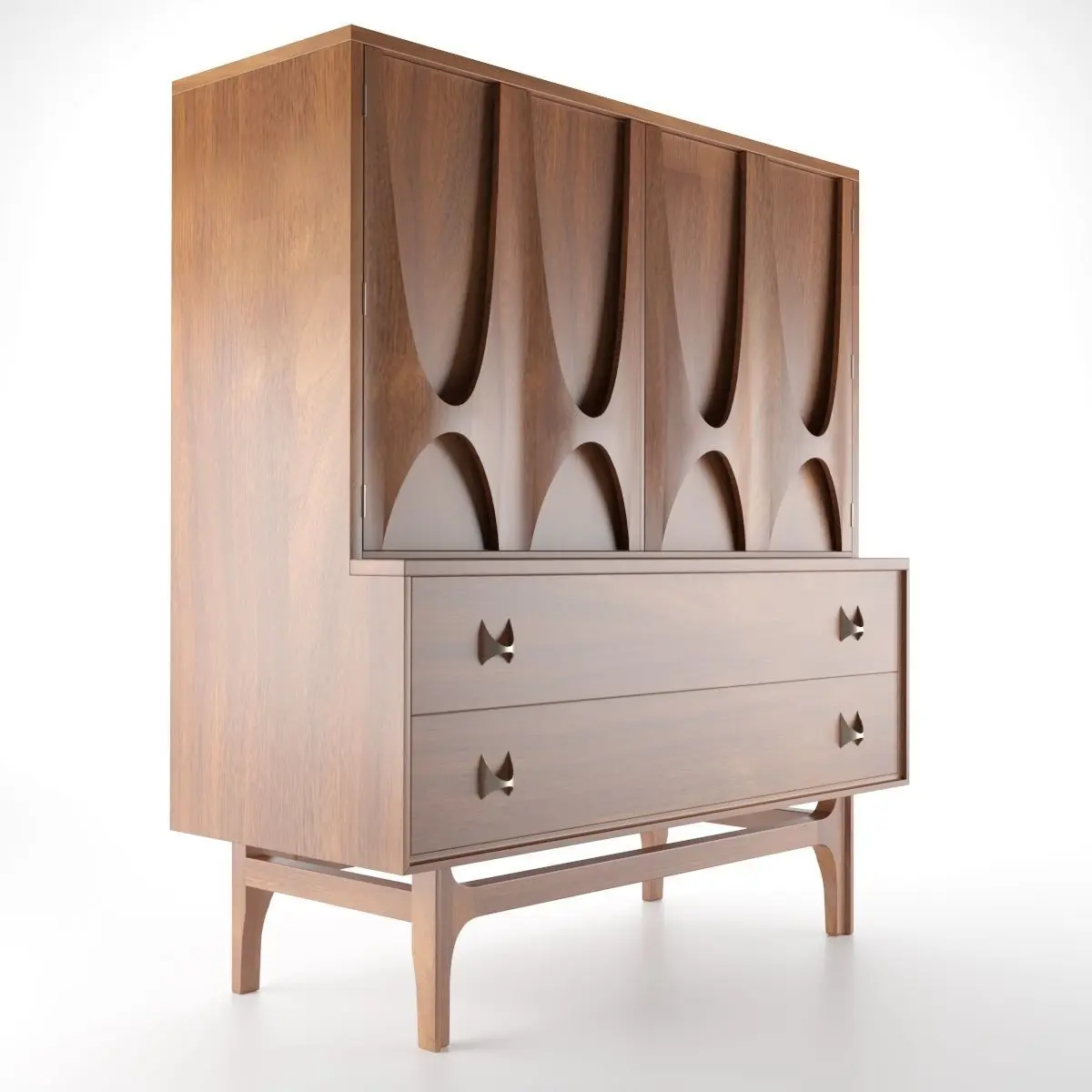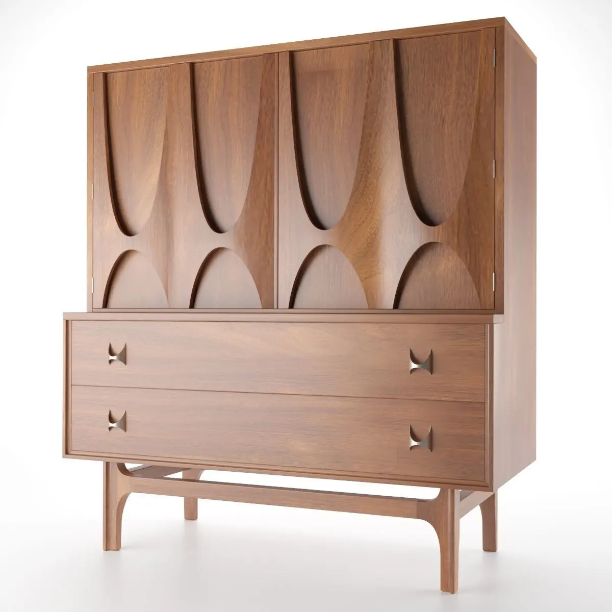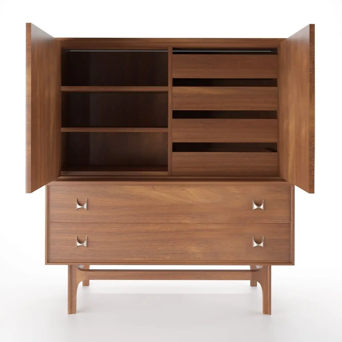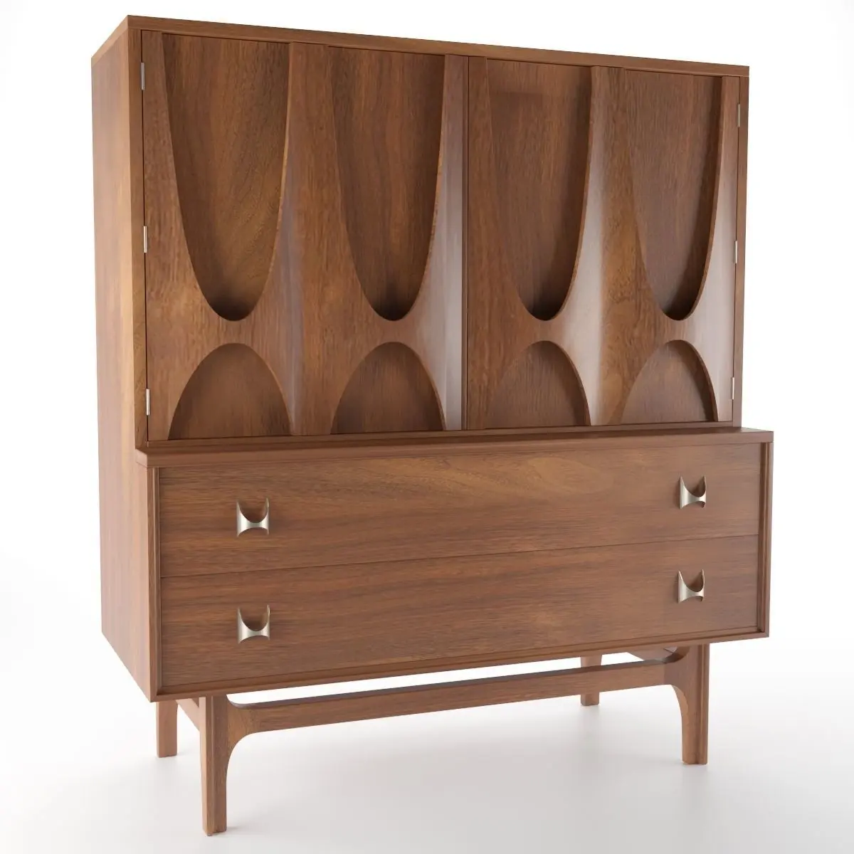 Broyhill Brasilia Tall Dresser - Gentleman's ChestDimensionsHeight: 49.75 in. (126.37 cm)Width: 44 in. (111.76 cm)Depth: 19 in. (48.26 cm)StyleMid-Century Modern (Of the Period)Materials and TechniquesOak,Walnut,VeneerPlace of OriginUnited StatesPeriod1960-1969Date of Manufacture1960sAboutClassic American Mid-Century Modern design. Brasilia two-door fitted chest by Broyhill Furniture. Ample storage with two large drawers below a two-door fitted cabinet. Solid oak secondary woods, dovetail construction and steel drawer glides. Very good original condition with some wear, small veneer chips and fading to top surface. Upper cabinet measures 16" D.