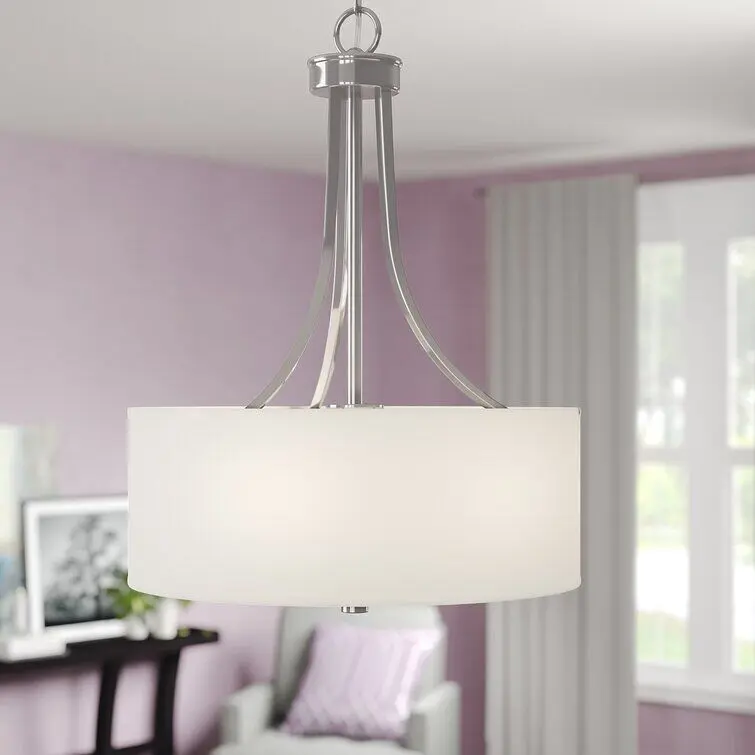 - Illuminate your space in tasteful, transitional style with this three-light chandelier! Crafted if the metal in a handsome brushed nickel finish, this fixture features a cylindrical pendant holder with swooping strap arms. A white fabric drum shade ensconces three incandescent A-type medium base bulbs to diffuse bright light as it’s dispersed throughout your space. An adjustable length of chain suspends the unit from a sloped ceiling-compatible canopy above to round out the design.