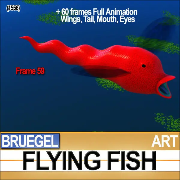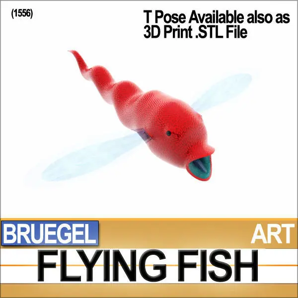 In the Package you will find:1. Flying Fish TPose Model [1]2. Flying Fish Original Bruegel Pose Model [2]3. Flying Fish Secondary Pose Standard Model & Hi-DEF Model [3]4. POSER & DAZ [Free Software] Posable Flying Fish Character Complete with 35 Morphs ready for Animation [4]5. 7 Static Poses for POSER & DAZ [5]6. 4 Animation Poses: 60 frames each loopable POSER & DAZ Flying Animation [6]7. 35 Full Complete Morphs to completely control Eyes, Mouth, Tongue, Head, Body [Bend Up, Down, Right, Left and 5 Wraps], Belly, Tail, First Wings & Secondary Wings [7]8. 1 POSER & DAZ Scene with complete 60 frames Flying Animation [8]9. OBJ 60 frames/models complete loopable Full Flying Animation [9]10. 3DS 60 frames/models complete loopable Full Flying Animation [10]11. 21 Hi-Quality Photoreal textures [1024x422, 990x730, etc.] [11]12. Tutorial Flying Animation [12]13. Tutorial Conversion C4D-OBJ to POSER-DAZ [13]14. Tutorial Conversion POSER OBJ-3DS to C4D-OBJ [14]15. 3DS Morph Model ready to be used to create Morph Targets for POSER & DAZ [15]16. 3D Print ready Model .STL file with Mesh Validity Certificate [16]