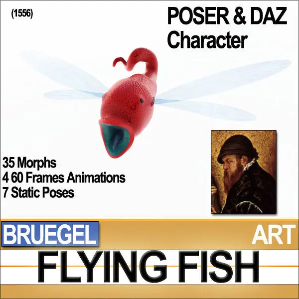 POSER Character Rigged and Animated [and for free software DAZ].C4D-VUE: Still not Rigged/Animated Model+ 60 frames OBJ-3DS Animation.__________________________________________Faithful Reconstruction of the 1556 Flying Fish Creature by the famous Flemish painter Pieter Bruegel the Elder. Poser & Daz Character 35 Morphs. Stl 3D Print. 60 frames OBJ-3DS Animation. C4D, 3DS, OBJ, POSER, DAZ, VUE6-7-8-9!___________________________________________Faithful Reconstruction of the Flying Fish by the famous Flemish painter Pieter Bruegel the Elder, as seen in his famous Black & White Print [1556 & 1557].Creature with Fish Head, Snake Body and Insect Wings. All naturally animated with Full Loopable Flying Animation.Colours-Textures reconstructed using Colours and original Textures from another famous painting by Bruegel [1562].
