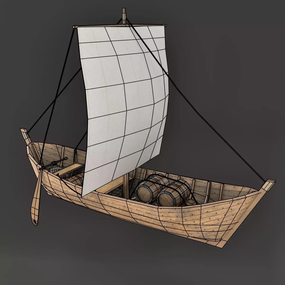 This 3D model represents the Bruges Boat, an early medieval Frisian vessel from the 5th–6th century, considered a predecessor of the cog. The ship is built in clinker construction, with side rudders and a rectangular sail following the Nordic tradition.The model is optimized with 3,851 polygons and comes with detailed 4K PBR textures. It is suitable for historical visualizations, educational projects, and possible use in games.The package contains multiple formats: .blend, .fbx, .obj, .stl, as well as the full texture set.