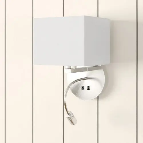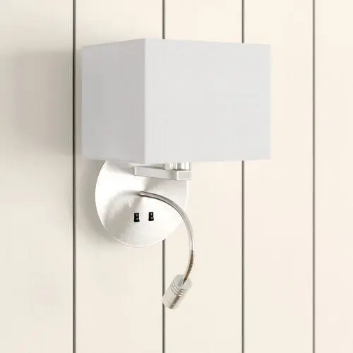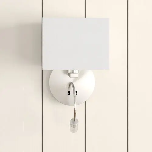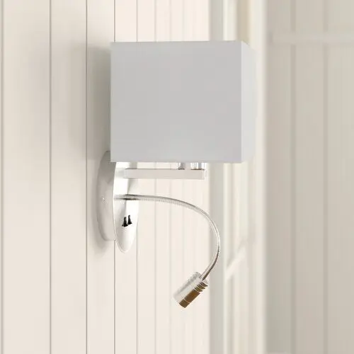 Overall31cm H x 17cm W x 17cm DShade17cm WOverall Weight0.2kgThis sleek and stylish wall lamp is a great way to brighten up any room in your home, it comes in a brushed chrome finish and has a white square fabric shade. It features an adjustable LED reading light which is perfect for reading and other tasks. This lamp makes a perfect alternative to a bedside table lamp.What's Included?SwitchFeaturesLight Swing Type: GooseneckProduct DetailsProduct Type: Armed SconceNumber of Lights: 2Power Source: HardwiredBulb Included: NoLight Direction: AmbientDimmable: NoRange of Fixture - Maximum: A++Shade IncludedShade Material: Fabric