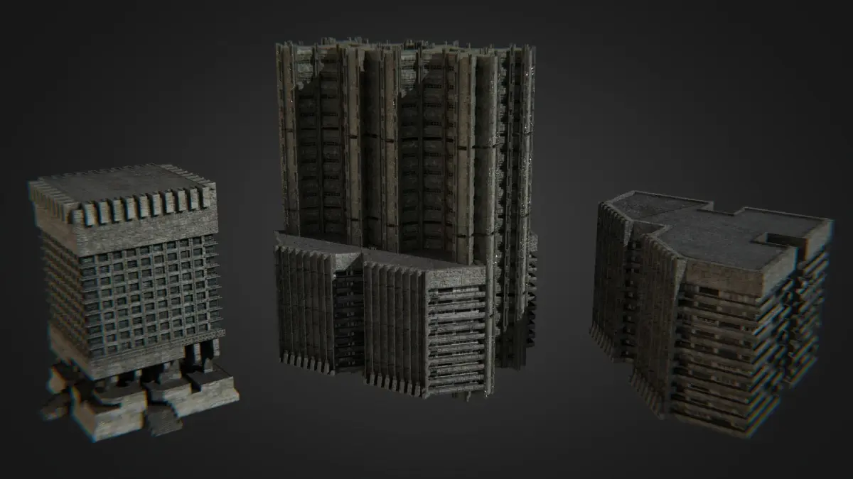 This asset pack is a simple and well rounded asset pack made for creating dark urban brutalist environments. It comes with an array of 10 well detailed buildings. Seven building block out objects, and a full market pack as well. These buildings are meant for background and foreground elements. However, they have enough feudality that they can be used in up close shots as well. Every building has a projection mapped style texturing system. Each texture comes with nodes to easily help with editing hue and values. One material (Brutalist Concrete) comes with a decal system, for added detailing. This asset pack will help you create your brutalist concepts much faster.
