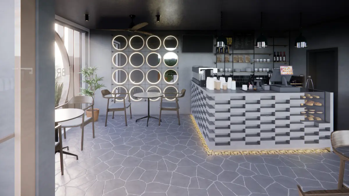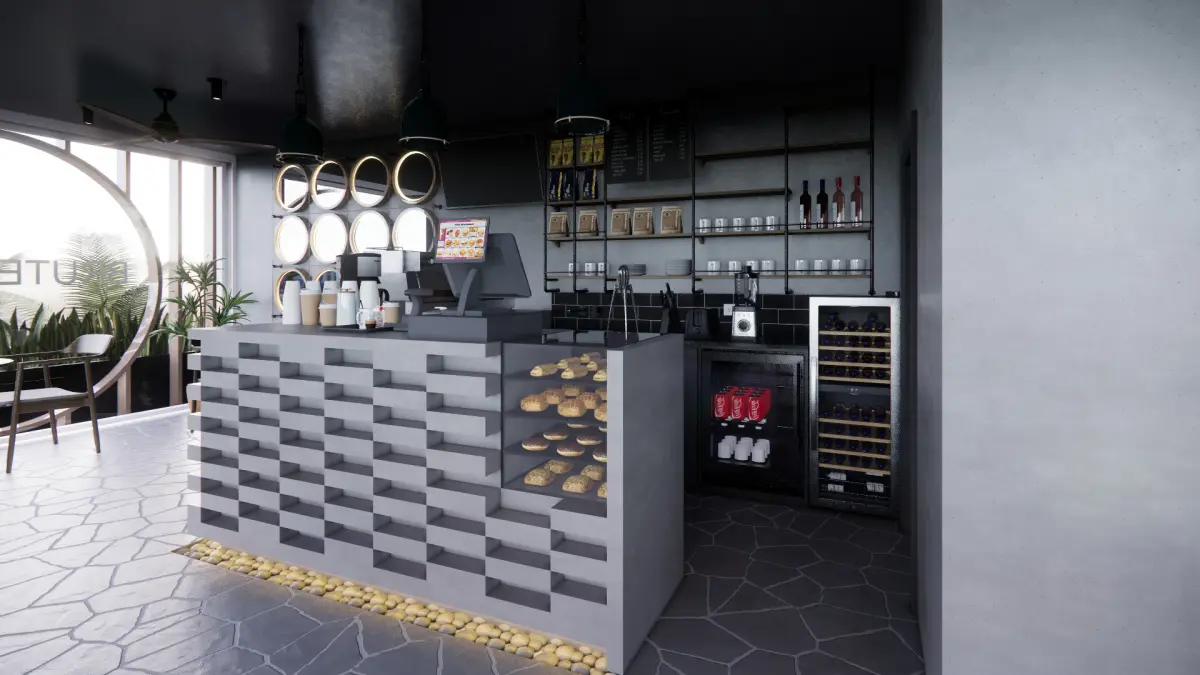 Brustalist coffee shop space. This file has no protection. It is a Brutalist-style coffee space ready to render with V-Ray or Enscape software. One will find FBX files that can be imported into various modelling applications, such as Maya, 3ds Max, SketchUp, and Blender. Inside the file, one will find multiple materials, a light setup, and camera angles that can easily be adjusted or changed to personal taste. This file does not have any protection. You can reuse the scene, the render settings, the lights, and the materials, but above all you can learn from the file, moving inside the project, observing how the light was created and handled, how materials are developed, what is the role that every texture play within them, and the values that fill every single option.