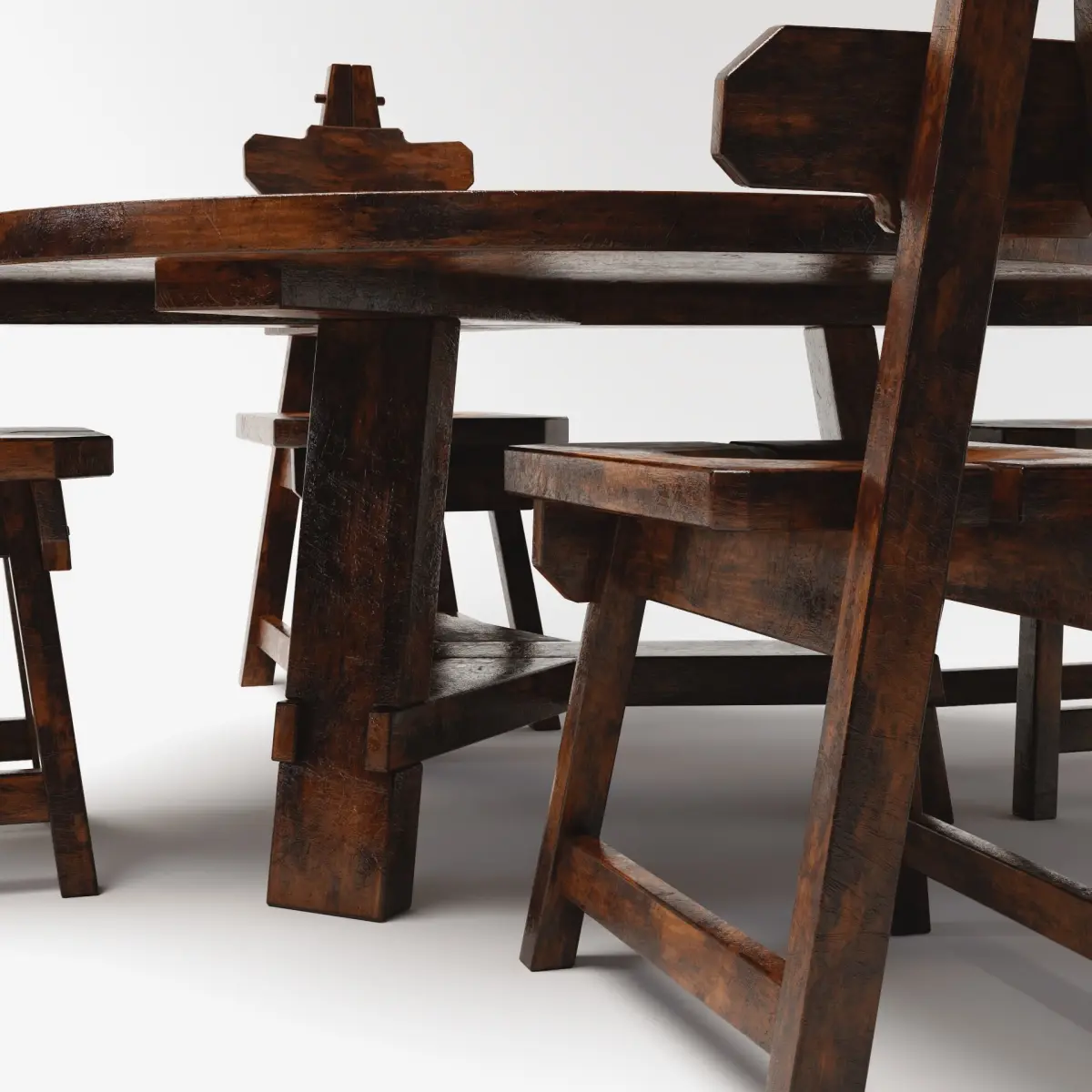 Vintage brutalist solid wood dining set. Perfect for modernist interiors! Table – Netherlands, 1960s. Chairs – Spain, 1970s.