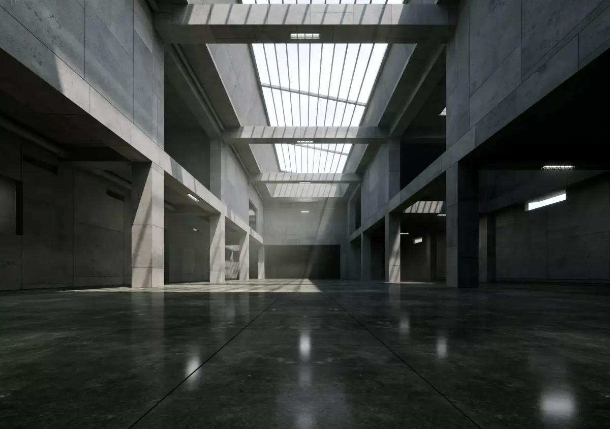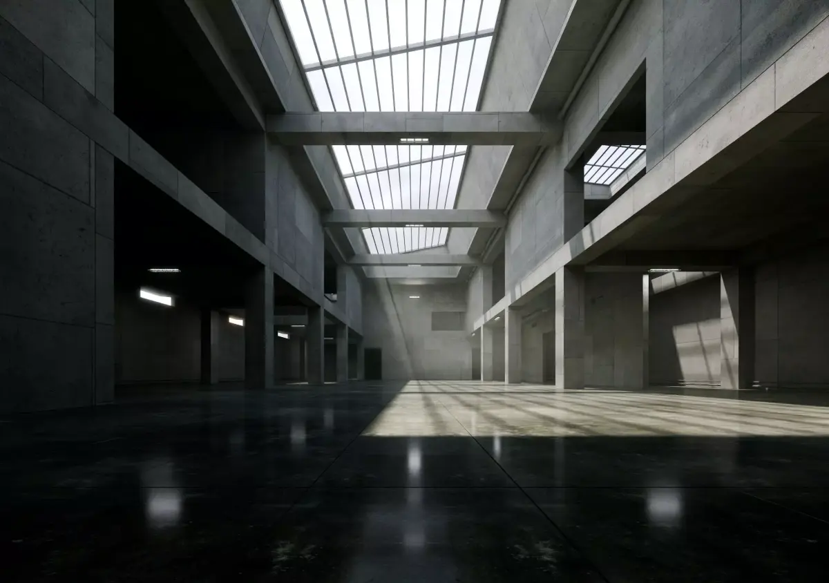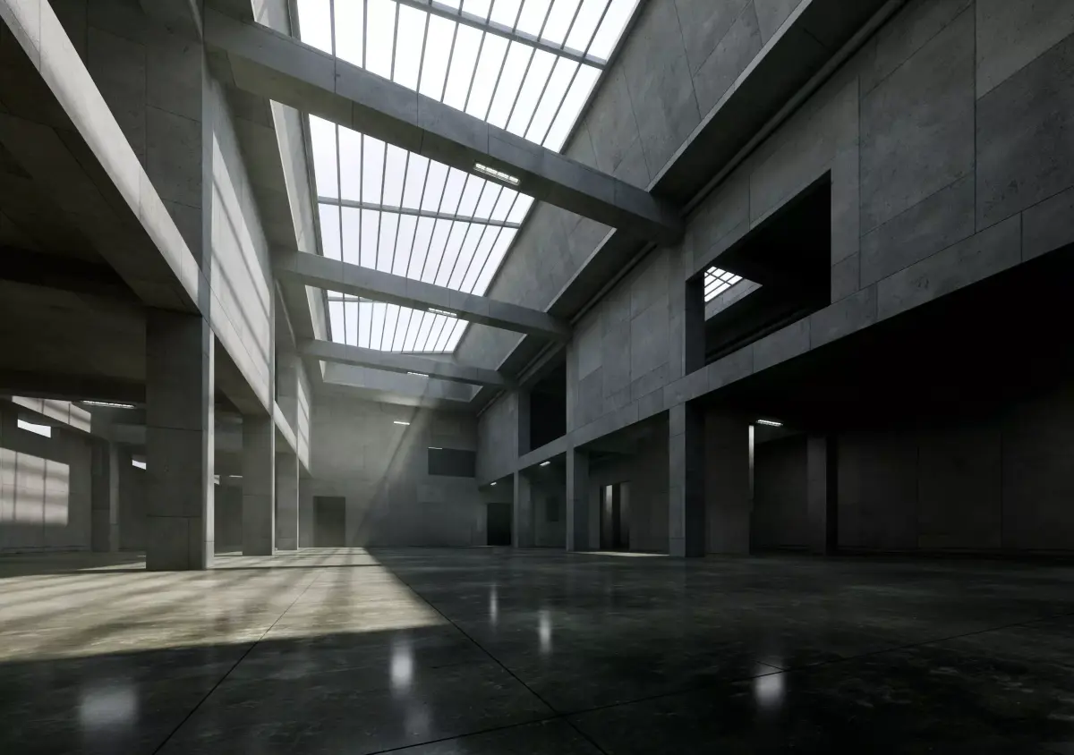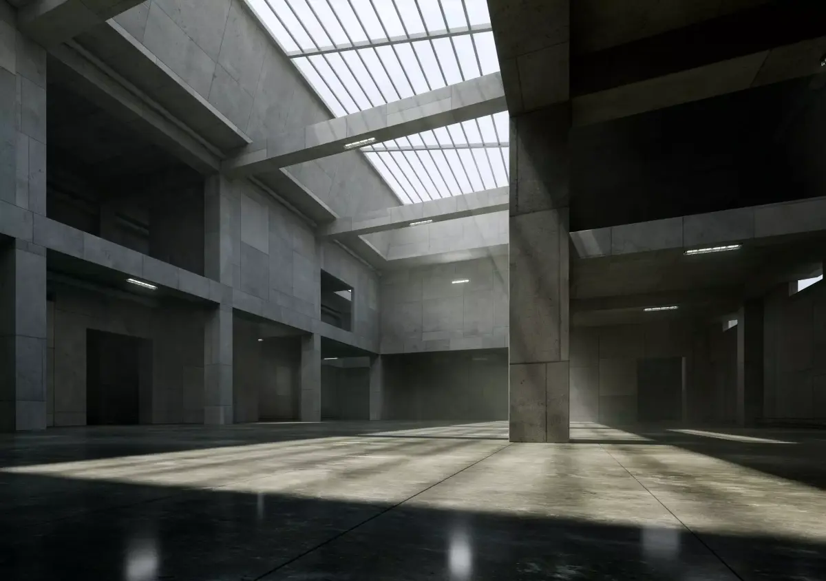 A cinematic brutalist atrium defined by strong concrete geometry and a dramatic overhead lightwell. Carefully balanced natural light creates deep shadows and atmospheric reflections, making this architectural background ideal for high-impact visual storytelling and concept presentations.