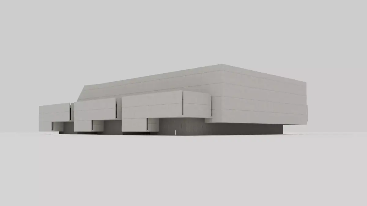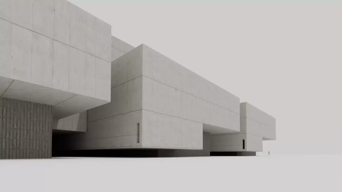 - Brutalist institutional theatre building with full exterior and interior. World scale. Designed for urban, dystopian, or architectural projects.