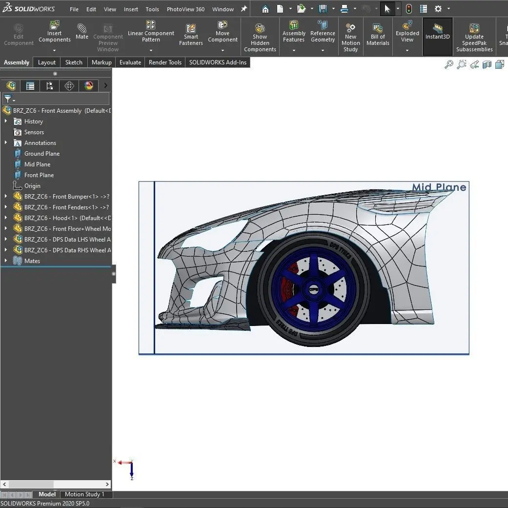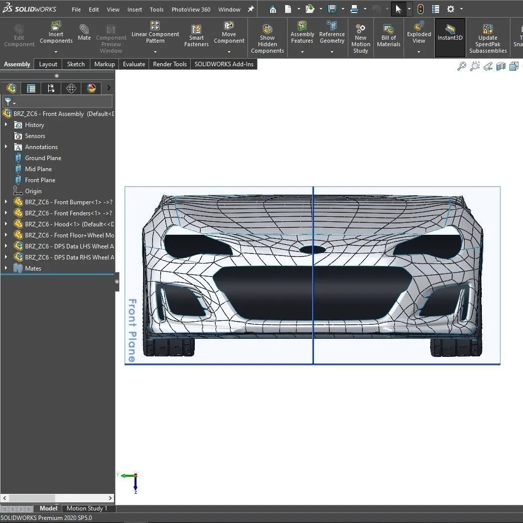 BRZ ZC6 Front End Surface assembly model in both SolidWorks 2020 & Parasolid file formats ready for import into most CAD systems. This assembly model is intended to help empower designers/enthusiasts looking for accurate data to design modifications such as front splitters/canards/fender vents/hood vents/overfenders/etc. for their cars. This model shares a common coordinate system with the other BRZ_ZC6 & 86_ZN6 models by DPS Data, allowing assembly of front/rear or full exterior surface assemblies by combining the components together. Expected dimensional variance in the data vs the real-life car is typically between 150-250 microns (0.006”-0.01”) with the methods used to create this model.Included in this download: SolidWorks 2020 & Universal Parasolid File Formats for each.[BRZ_ZC6 - Front Assembly] assembly file.[BRZ_ZC6 - Front Bumper] component file.[BRZ_ZC6 - Front Fenders] component file.[BRZ_ZC6 - Hood] component file.[BRZ_ZC6 - Front Floor + Wheel Mounts] component file.[BRZ_ZC6 - DPS Data LHS Wheel Assembly] assembly file.[BRZ_ZC6 - DPS Data RHS Wheel Assembly] assembly file.[DPS Data Wheel Variant 4 - BRZ_ZC6] component file.[DPS Brake Rotor - FL - BRZ_ZC6] component file.[DPS Brake Rotor - FR - BRZ_ZC6] component file.