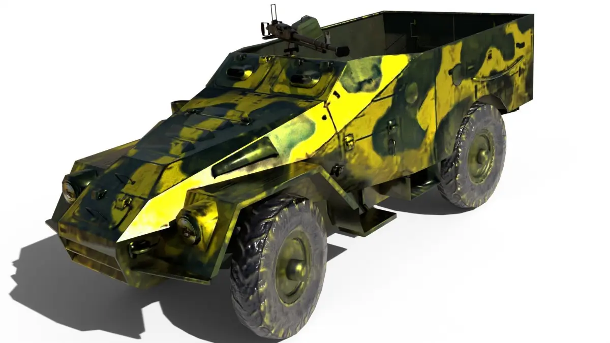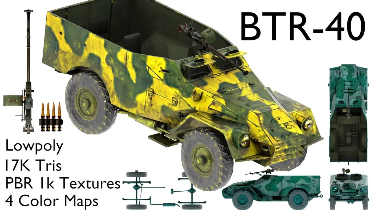 Lowpoly Blender model , rendered with cycle.3 objects (body,interior,and machine gun).PBR Textures 1k except for the gun it si 256px, but suitable for overall.There are 4 different color maps for the ody part.Files : Blender source file , Obj , Fbx and Dae formats