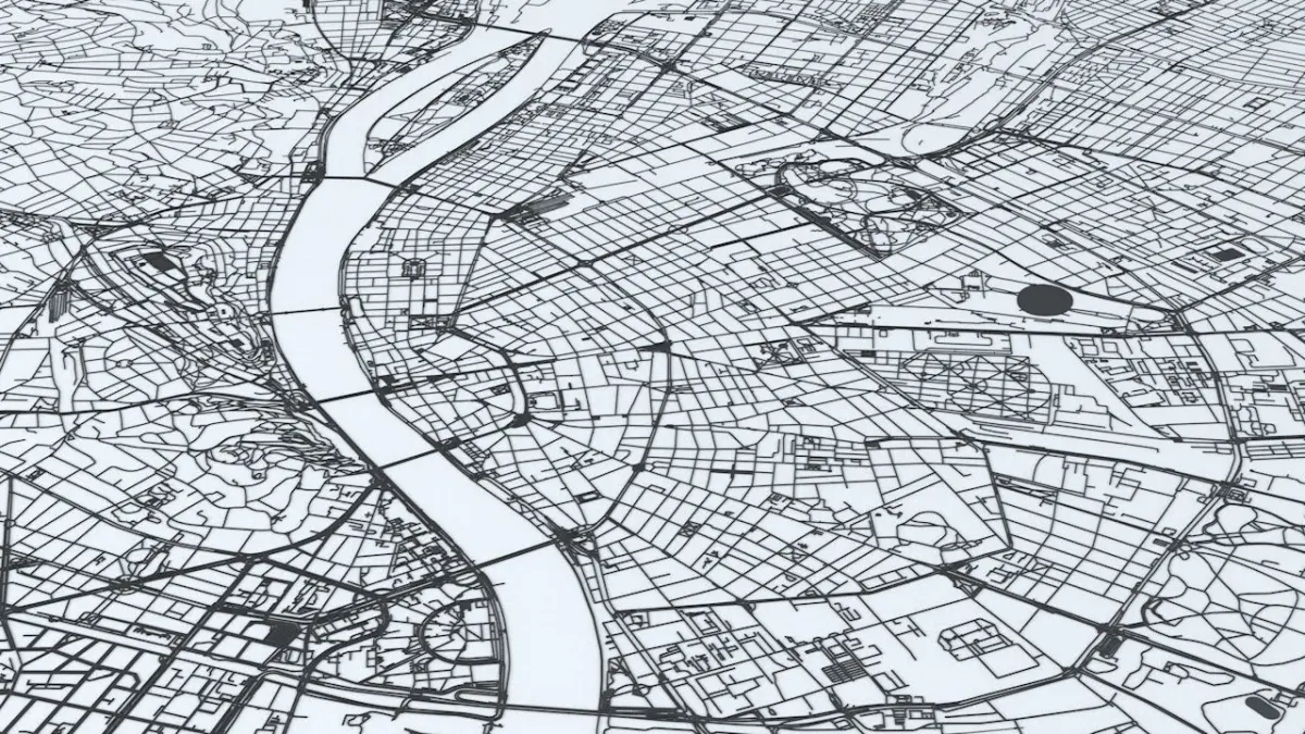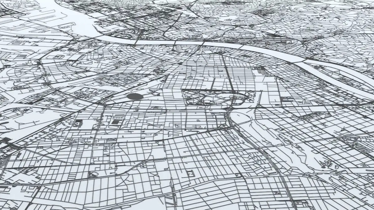 - the model is positioned on a flat surface (road network is on the “floor” - no elevation data included)