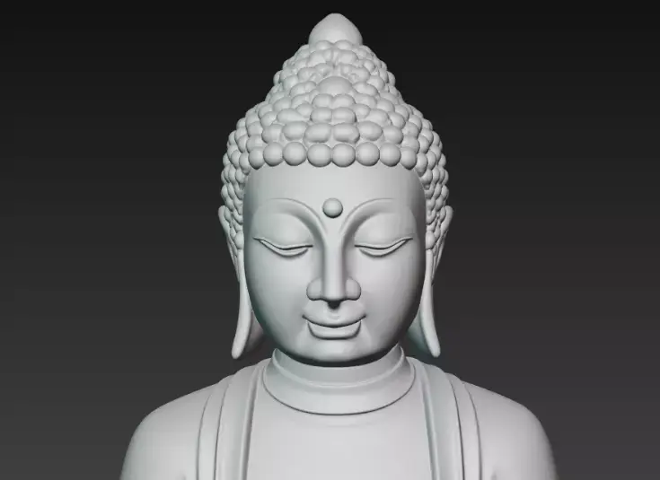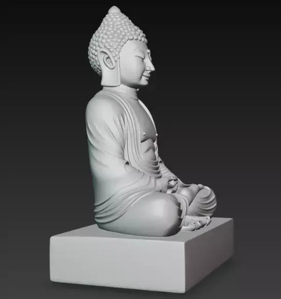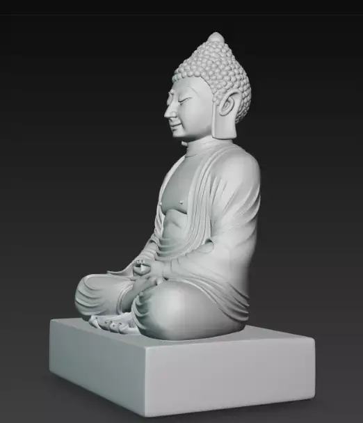 A detailed 3D-rendered Buddha statue in a meditative pose, featuring flowing robes and a calm expression, perched on a simple square base.