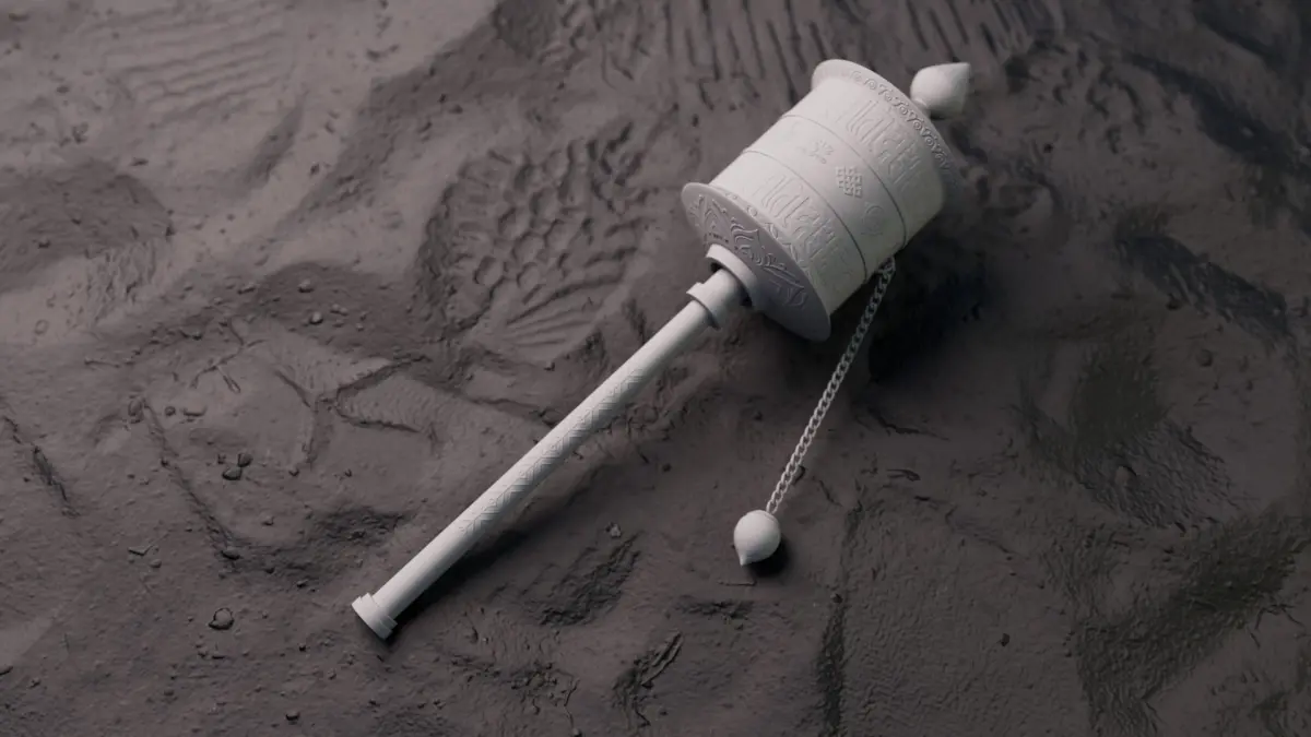 A Buddhist prayer wheel is a cylindrical device, often with a handle, containing prayers or mantras, typically associated with Tibetan Buddhism. Turning the wheel is believed to have the same merit as reciting the prayers or mantras it contains, and is considered a powerful practice for accumulating blessings and purifying negative karma. Made in maya, textured in substance. Low poly