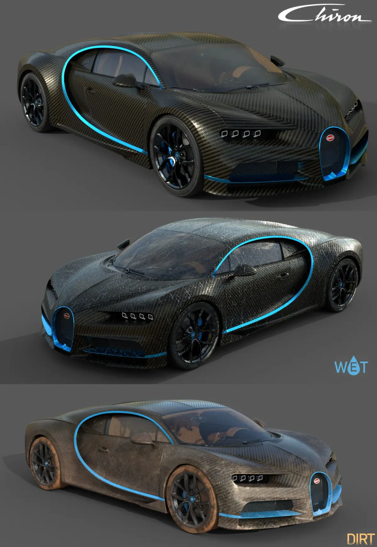 Ready to be used in any engine this PBR Textured and Rigged Bugatti has less than 92k polys and includes 3 variations: Clean, Wet and Dirty, *Model textured in substance painter*Model made using Midpoly workflow for exterior and Lowpoly Baking workflow for interior