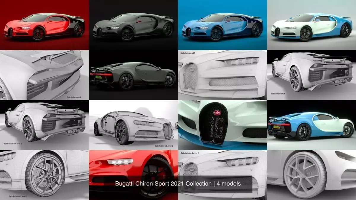 3D collection of Bugatti Chiron Sport 2021 with realistic, perfect models and props. Cars is a high quality, photorealistic model that will increase detail and realism in any rendering. Car models with first-class workmanship. They are designed exactly like the original. And the scene is set for every file format (except fbx and obj). Every part of the model is available for anti-aliasing and you can manually adjust the detail/softness of the model. To avoid hassle, everything is in groups and the unit is cm. Scenes come pre-installed and are ready to be processed at the touch of a button. It will make your project more stylish and more realistic. The texture files are provided alongside. The model has a fully textured, detailed design, allowing close-ups, and was originally modeled in Cinema 4D and 3ds Max and rendered in Corona and V-Ray. You and the product can start using as soon as you download it. This topology is fully optimized and can be opened by all computers. The product comes to you without antialiasing. For anti-aliasing, you can apply Subdivision Surface in Cinema 4D and MeshSmooth in 3ds Max. If you wish, you can look at other colors of the product in my market. - Made with Ray 5. Models appear as low polygon. For model quality, please apply anti-aliasing. The rear spoiler has been revived. It can be modified for 3ds Max and Cinema 4D.