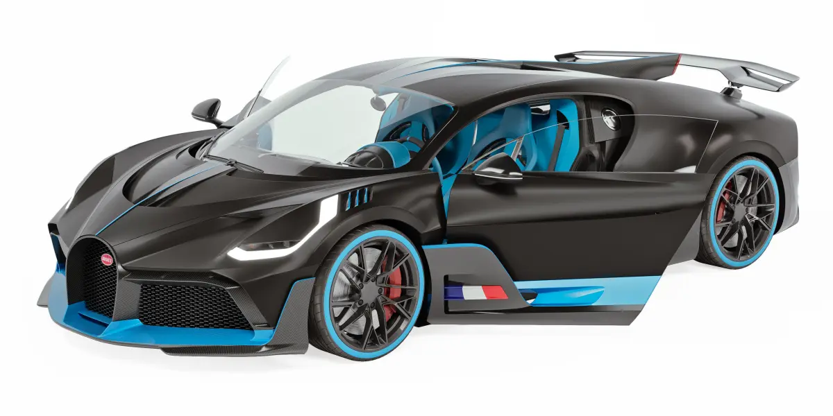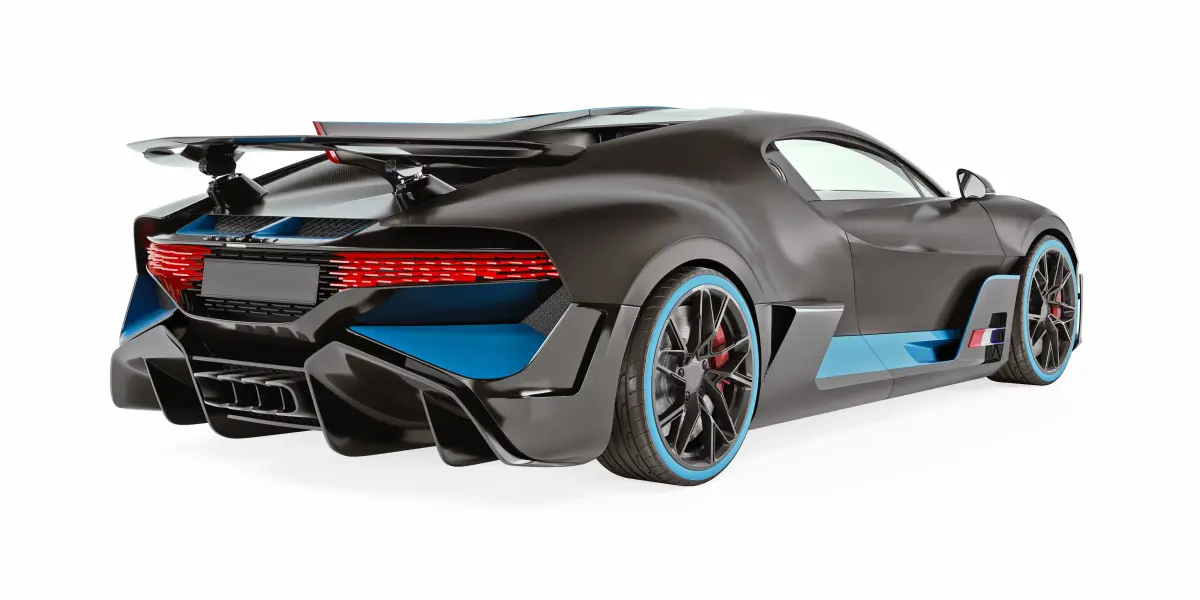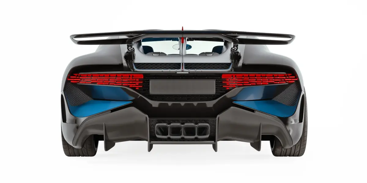 The car takes inspiration from the Bugatti Type 57SC Atlantic along with the Bugatti Vision Gran Turismo concept in terms of design and has track performance as its main focus. The car includes a redesigned exhaust system featuring quad exhaust pipes, a 1.8 metre wide fixed rear wing (23% wider than the retractable wing on the Chiron), a NACA duct on the roof that channels air to the rear of the car on a central fin and ultimately on the rear wing for improved downforce, a large front chin spoiler, more refined side skirts, larger air intakes on the front, new head lamps and tail lamps, a vent in the bonnet for improved radiator cooling and vents on the front wheel arches to cool the brakes.