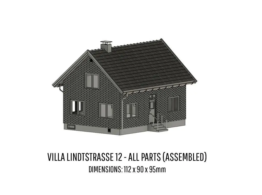 The set contains all items neccesary to build a H0-scale model of the villa on Lindtstrasse 12. Ready-to-print super detailed items set for H0-scale Model Railroad. The villas has been developed and test printed, built and painted to verify function, detail and printability. Testing has been performed on a range of (4k, 6k and 8k) consumer grade resin printers. Simply download, un-zip, slice, save to USB and print. Enjoy!Each part has two stl-files included: One stl-file with support (for resin printers) and one without supports. This way you can customize your print if you like.