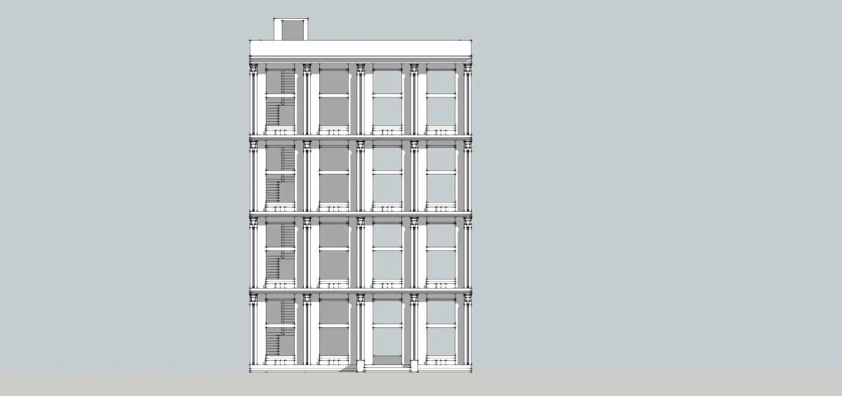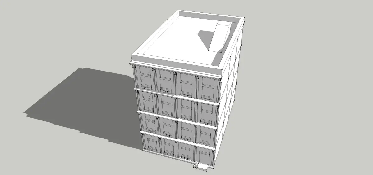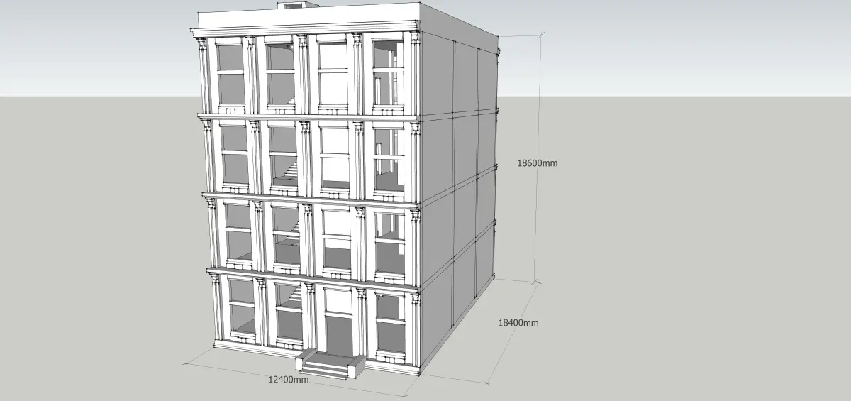 Sketchup model. Building for buisness. 12.4x18.4x18.6(h)m. Frame structure buildingSimple 4 storey building. Сeiling height - 4m. Classicism stiled. Real sized model. Every element on proper layer. Poor decorated building. No texturing. House without furtinure, systems, only building, structure, roof and base. Perfect for games, for interior designing and etc.